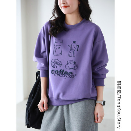 铜扣记纯棉卫衣女圆领印花休闲百搭宽松显瘦秋季新款韩版长袖上衣