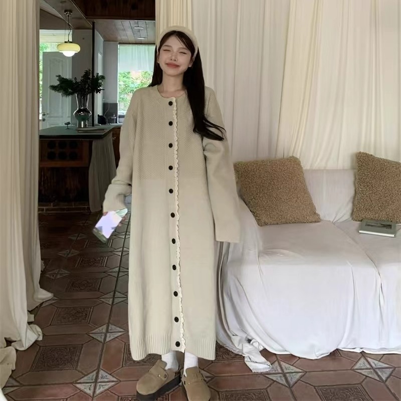 大码复古慵懒风长袖针织开衫连衣裙女秋冬季胖妹妹设计感长款裙子