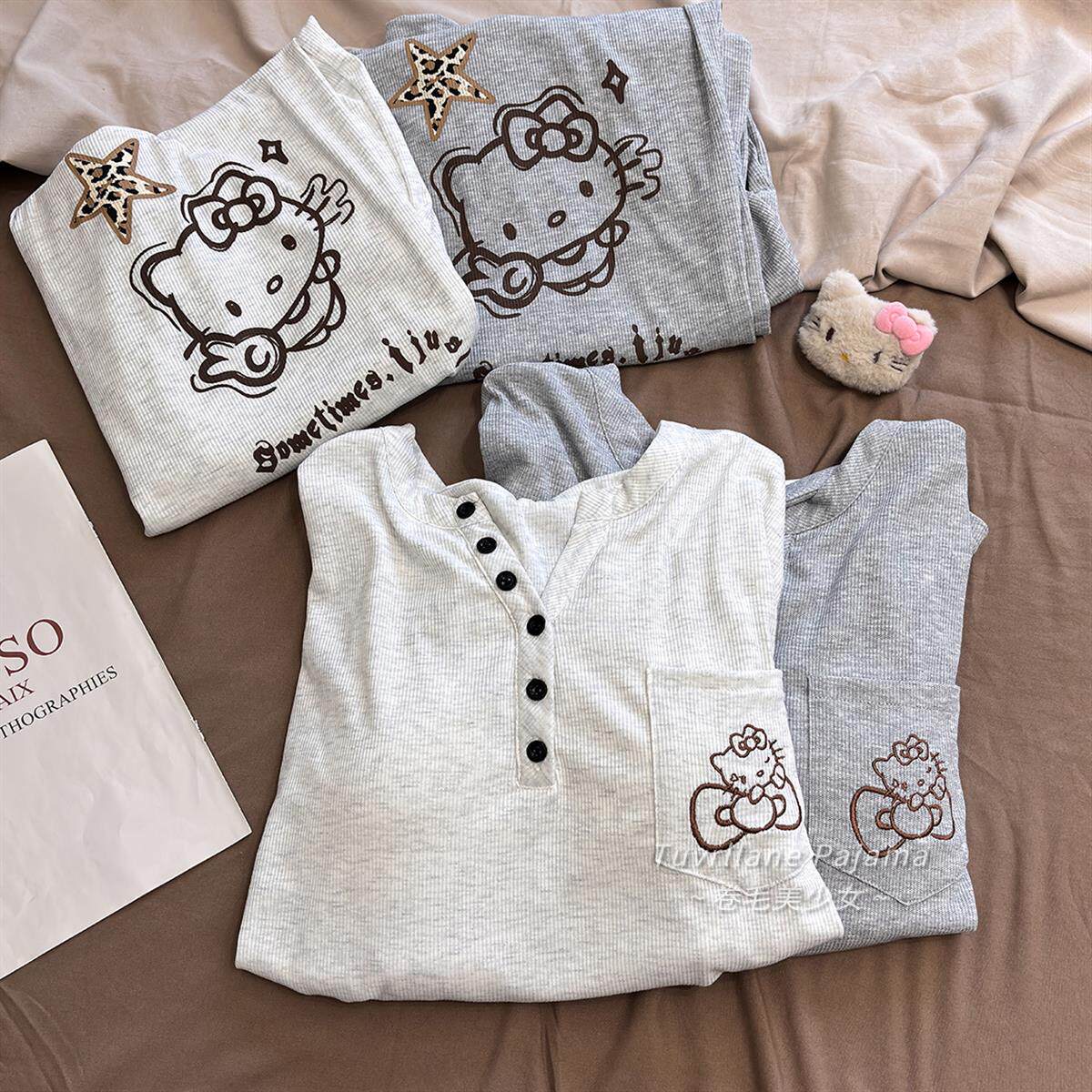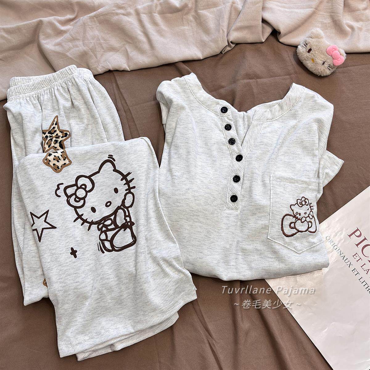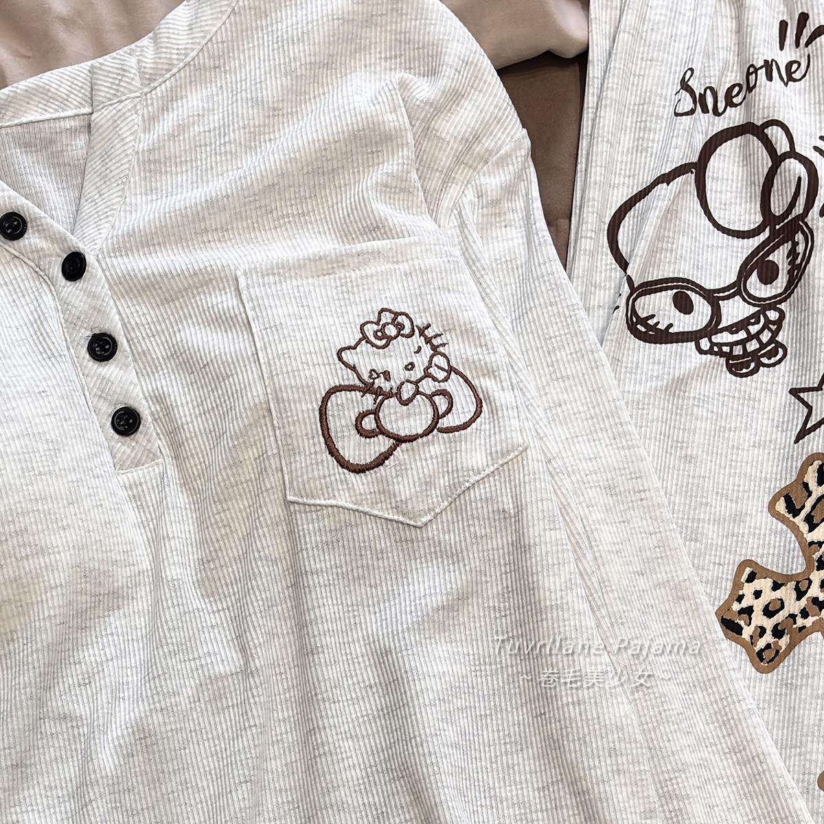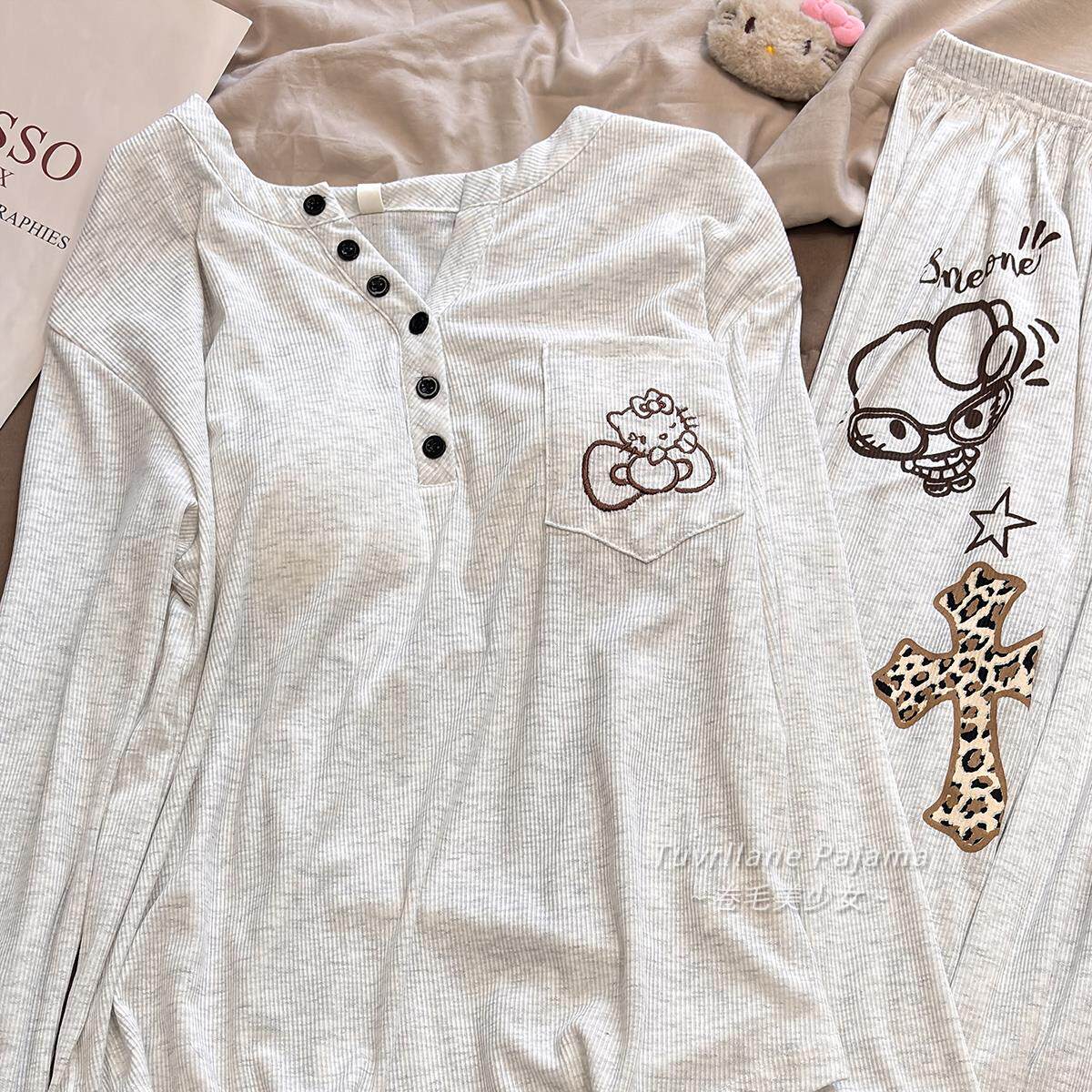 软乎乎莫代尔带胸垫长袖睡衣女春秋季新款卡通凯蒂猫休闲风家居服