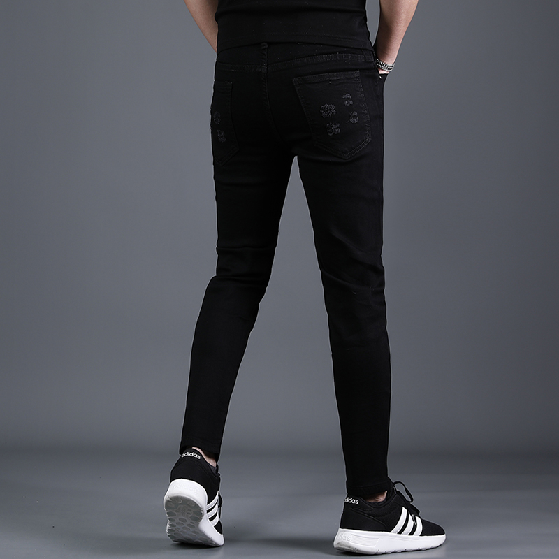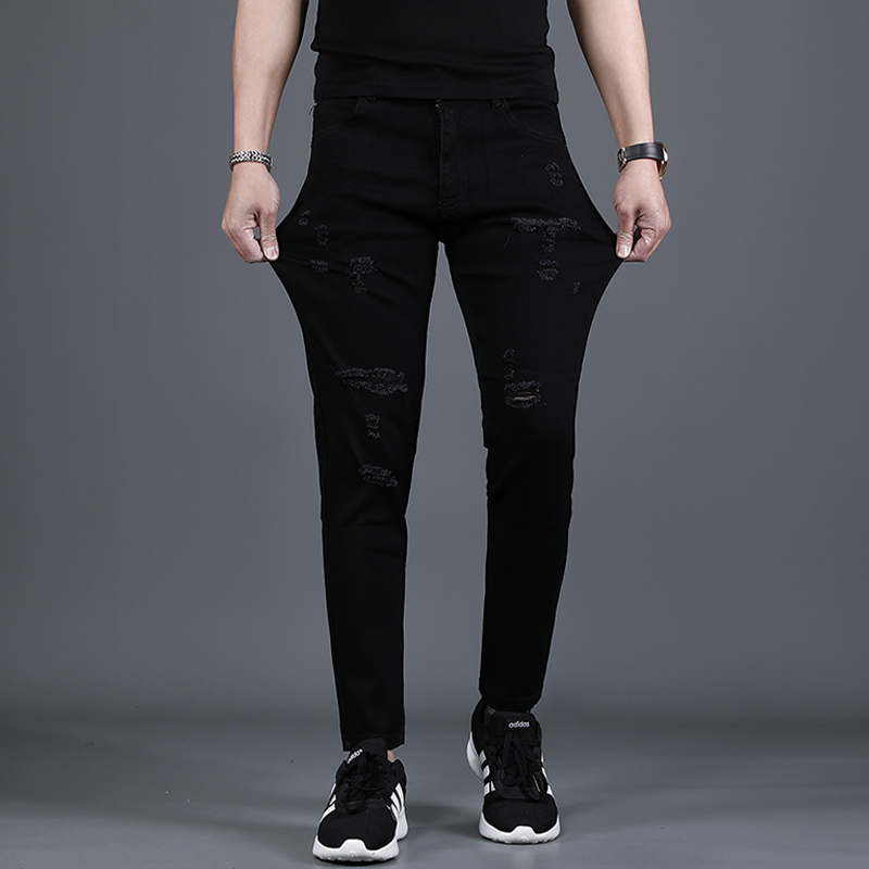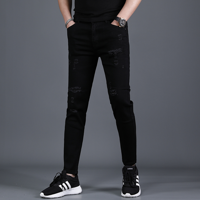九分破洞黑色牛仔裤男修身小脚新款潮流显瘦9分休闲裤子男ins痞帅