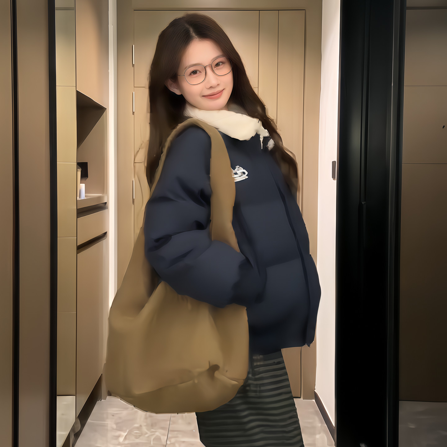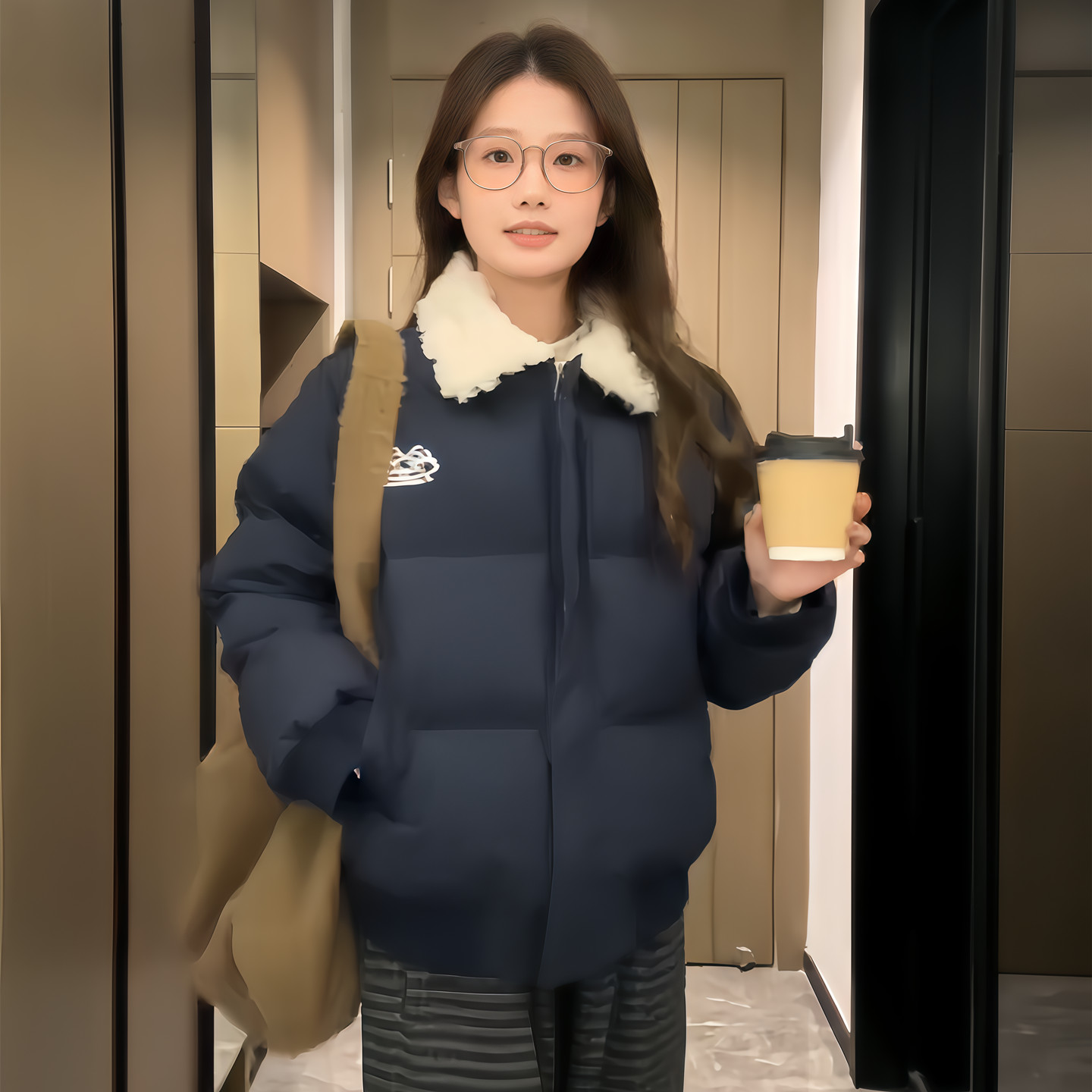美拉德潮牌字母刺绣羊羔绒羽绒棉服女冬季短款加厚小个子棉袄外套