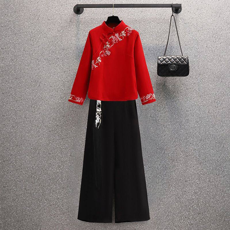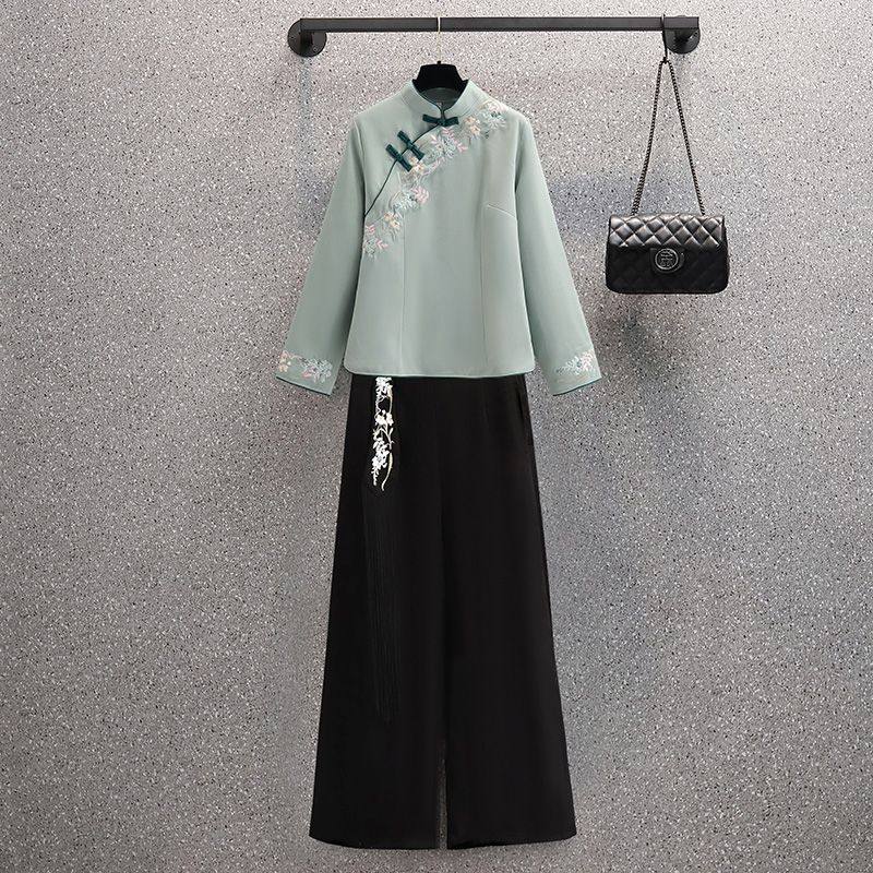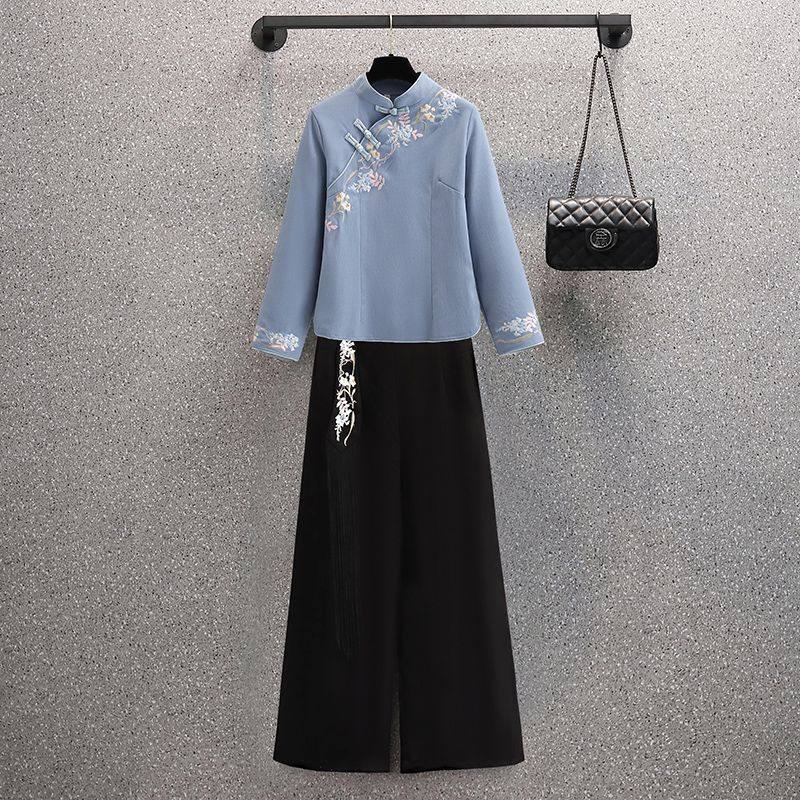 秋冬新款复古超大码民国风套装300斤洋气显瘦上衣阔腿裤子两件套