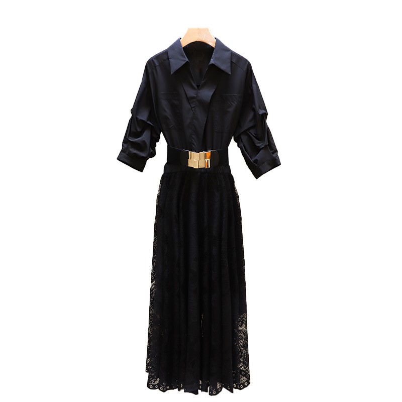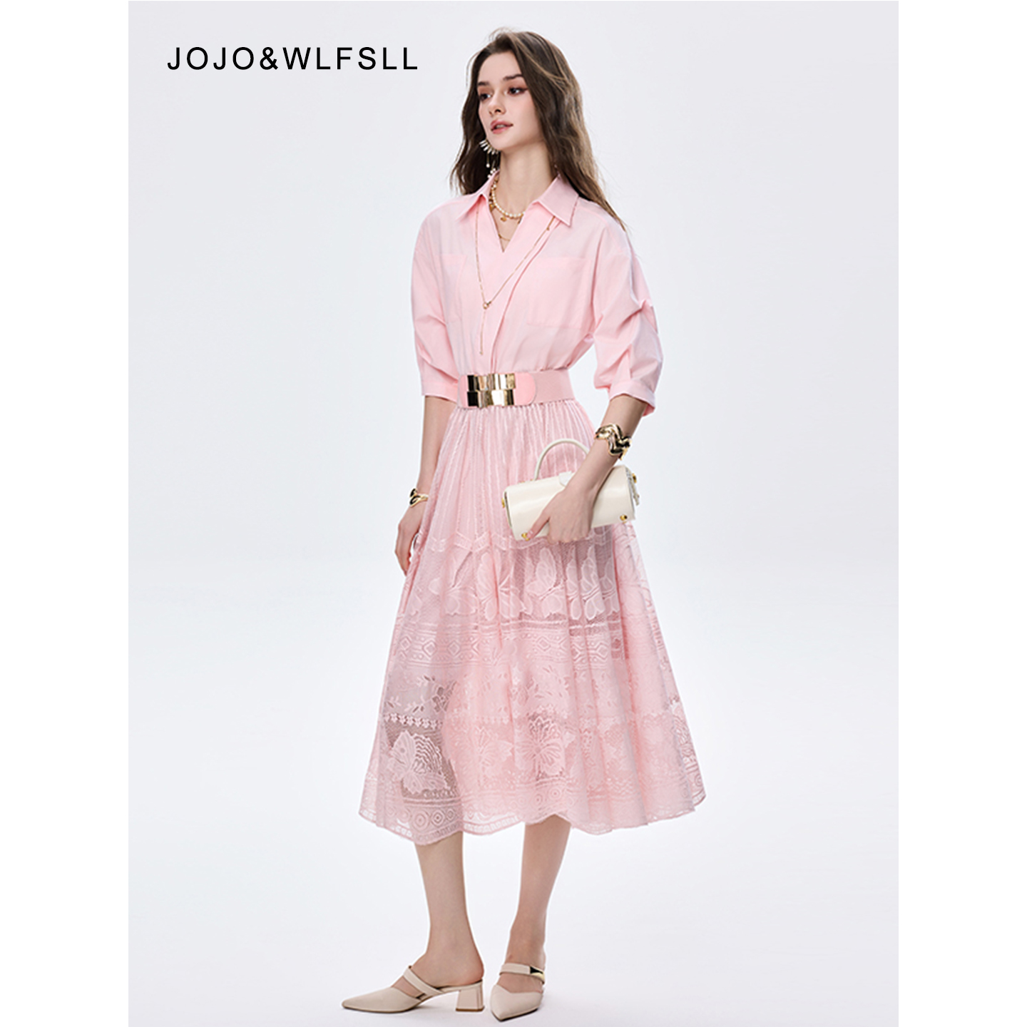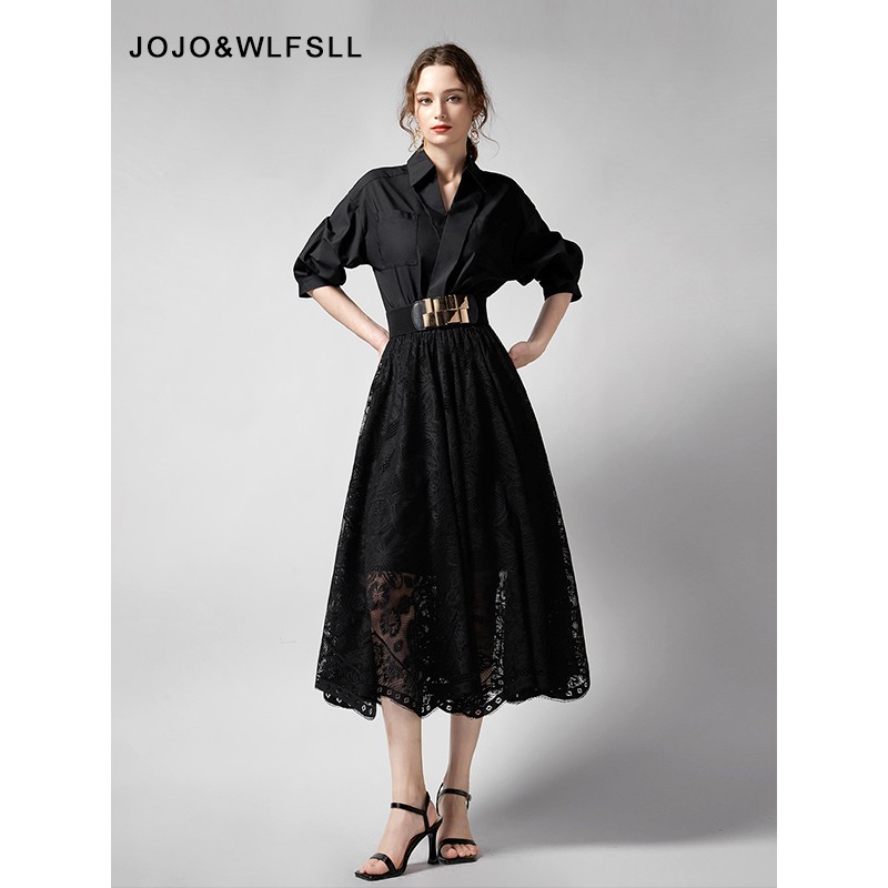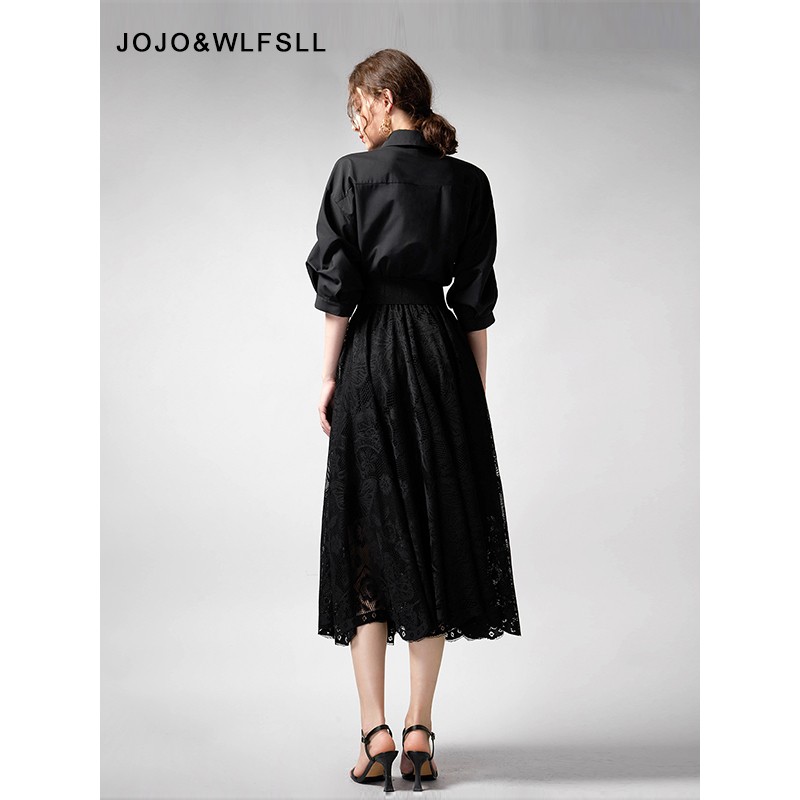 JOJOWLFSLL通勤职业设计感衬衫连衣裙2025秋冬新款高腰蕾丝大摆裙