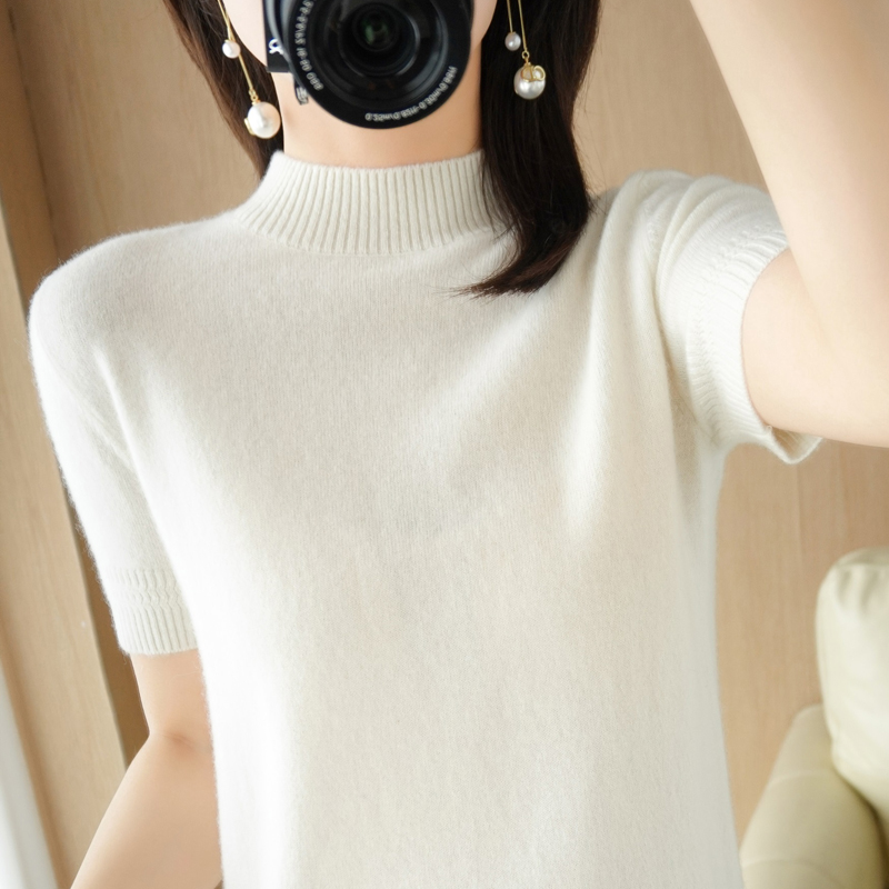 春秋半高领短袖羊毛衫女宽松短款打底半袖针织衫春秋半高领短袖羊