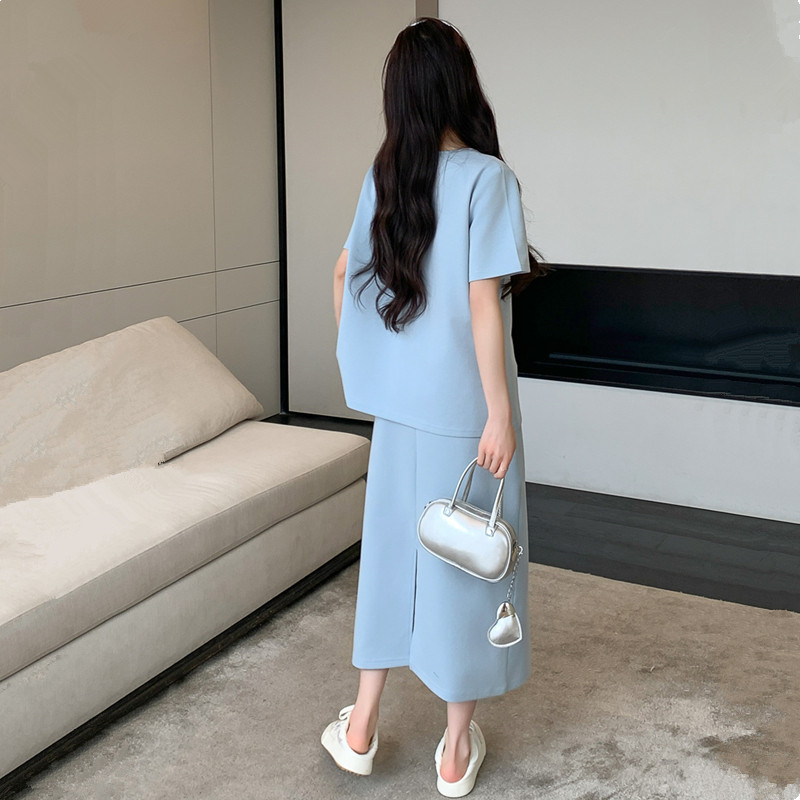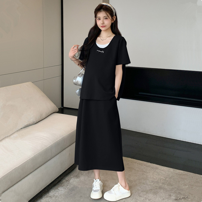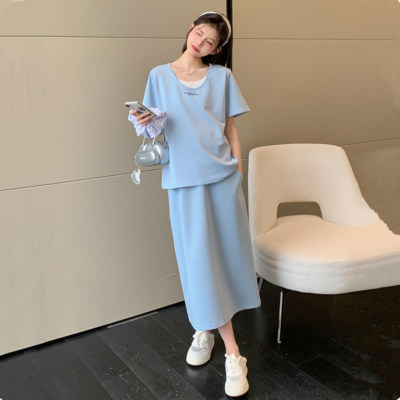 休闲风孕妇装夏季短袖拼接T恤裙套装2025新款潮妈孕期开叉半身裙