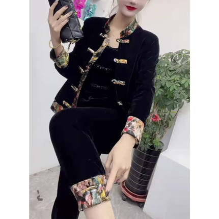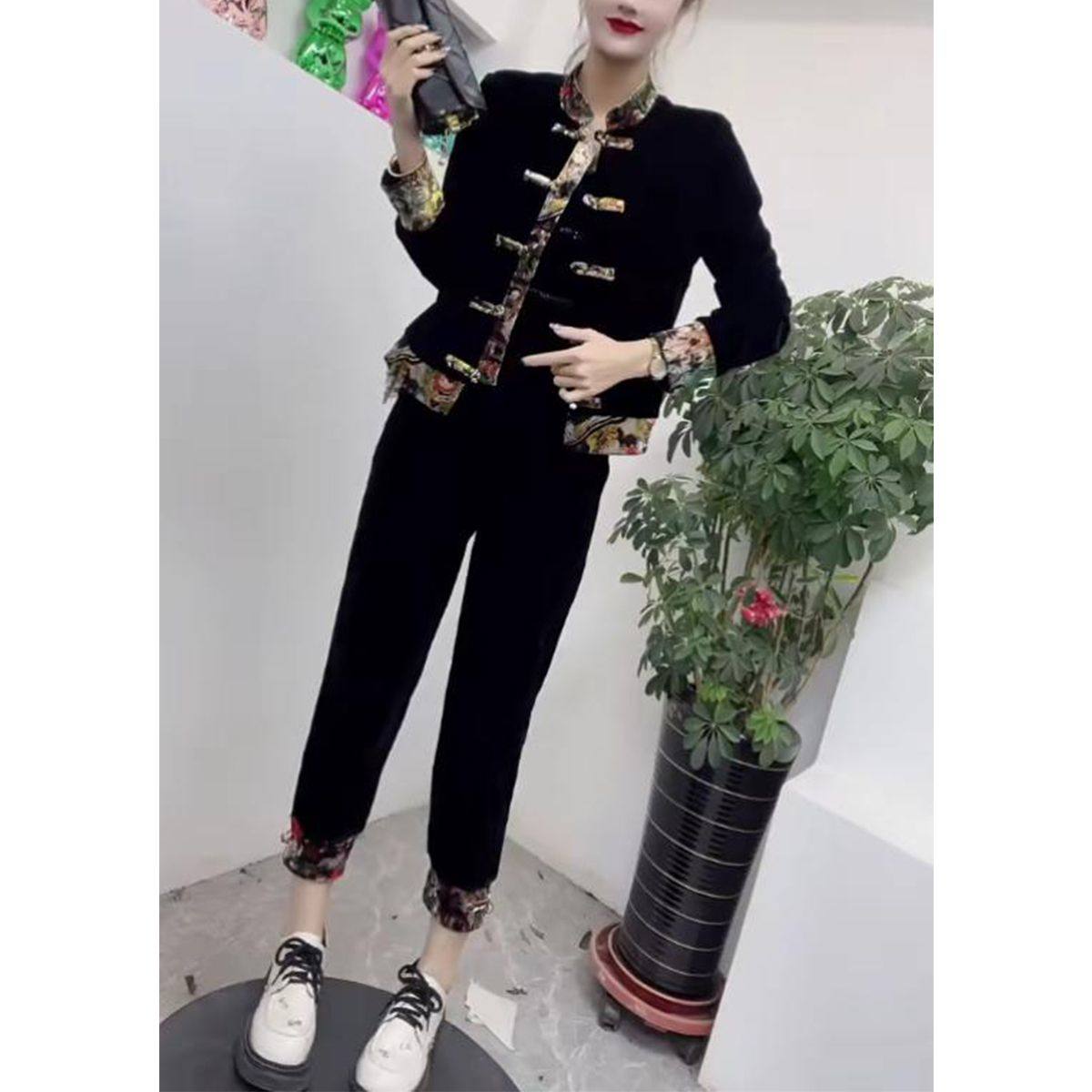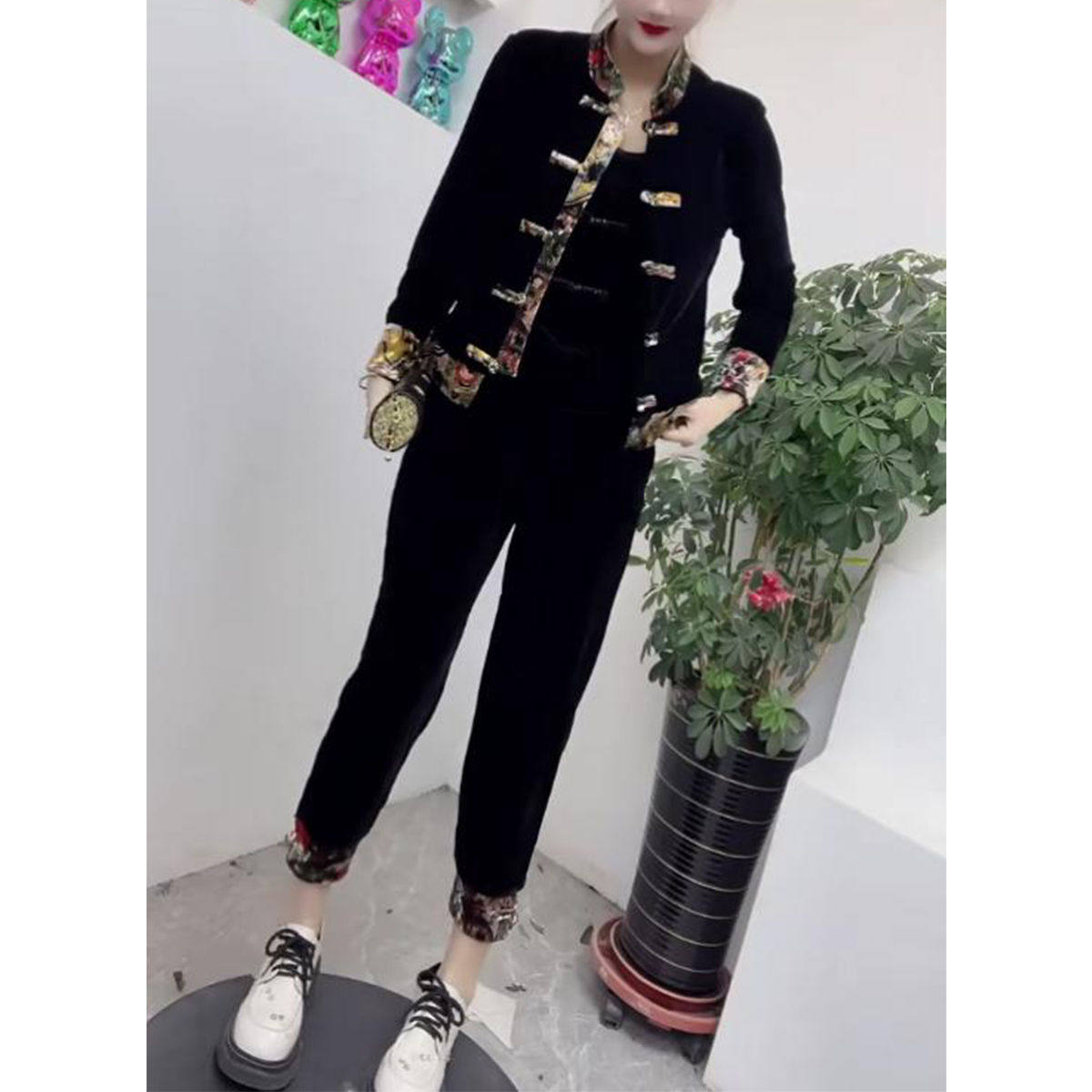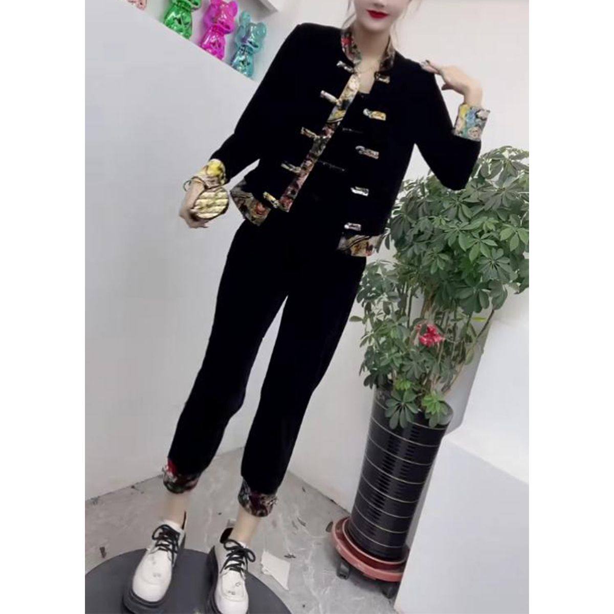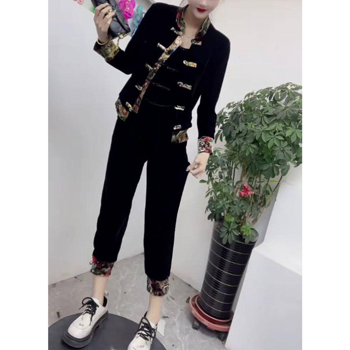 2025春秋新款时尚大码显瘦国风丝绒盘扣开衫上衣九分裤两件套装女