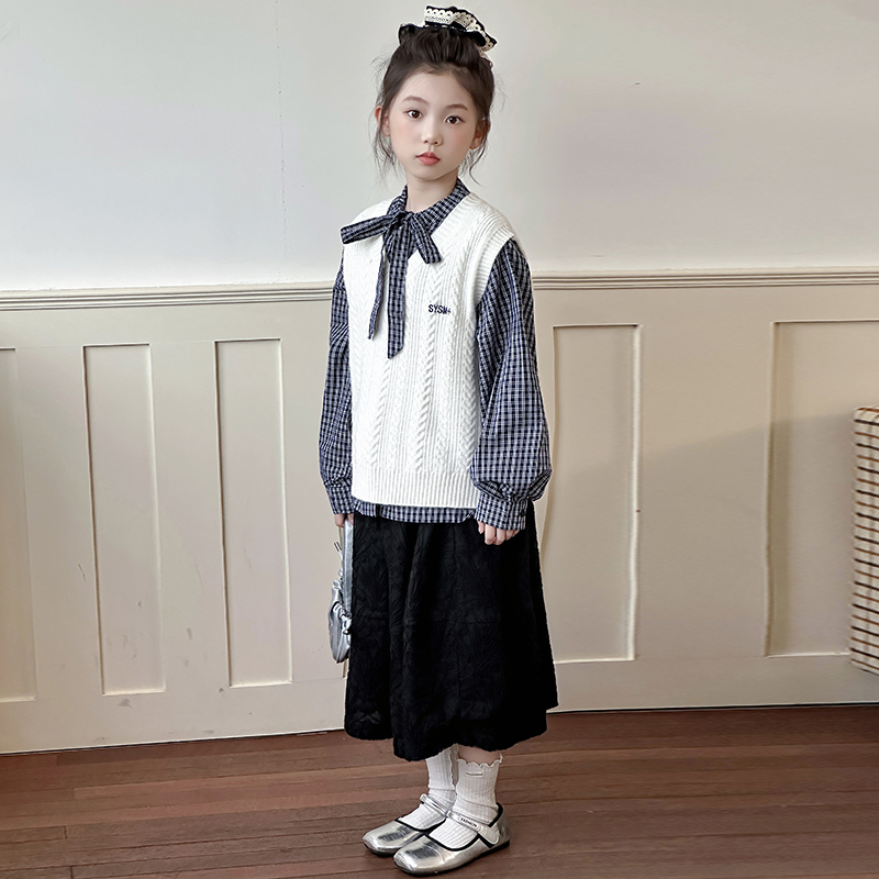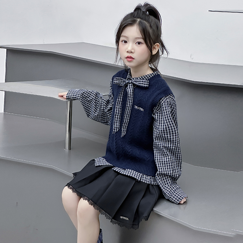 女童格子衬衫毛衣背心针织衫两件套秋季超好看学院风洋气时髦卫衣