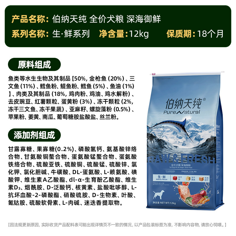 臻选伯纳天纯狗粮生鲜冻干全价通用型12kg金枪鱼+三文鱼