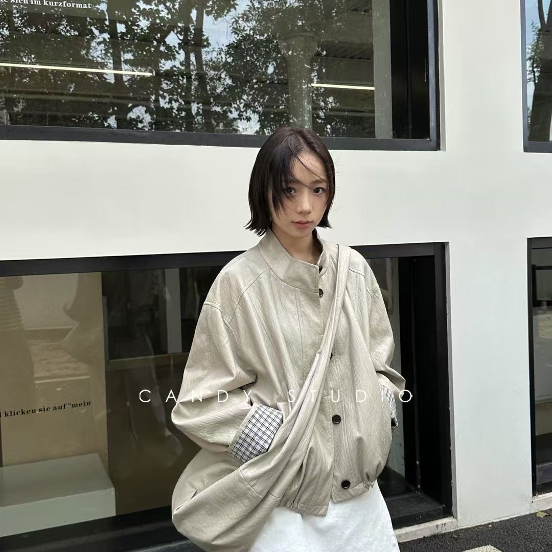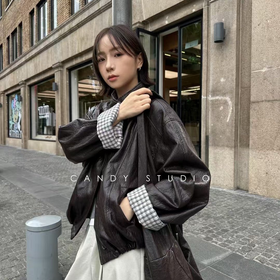 带包包糖果2025新款皮衣外套女短款小个子机车服夹克上衣格子袖口