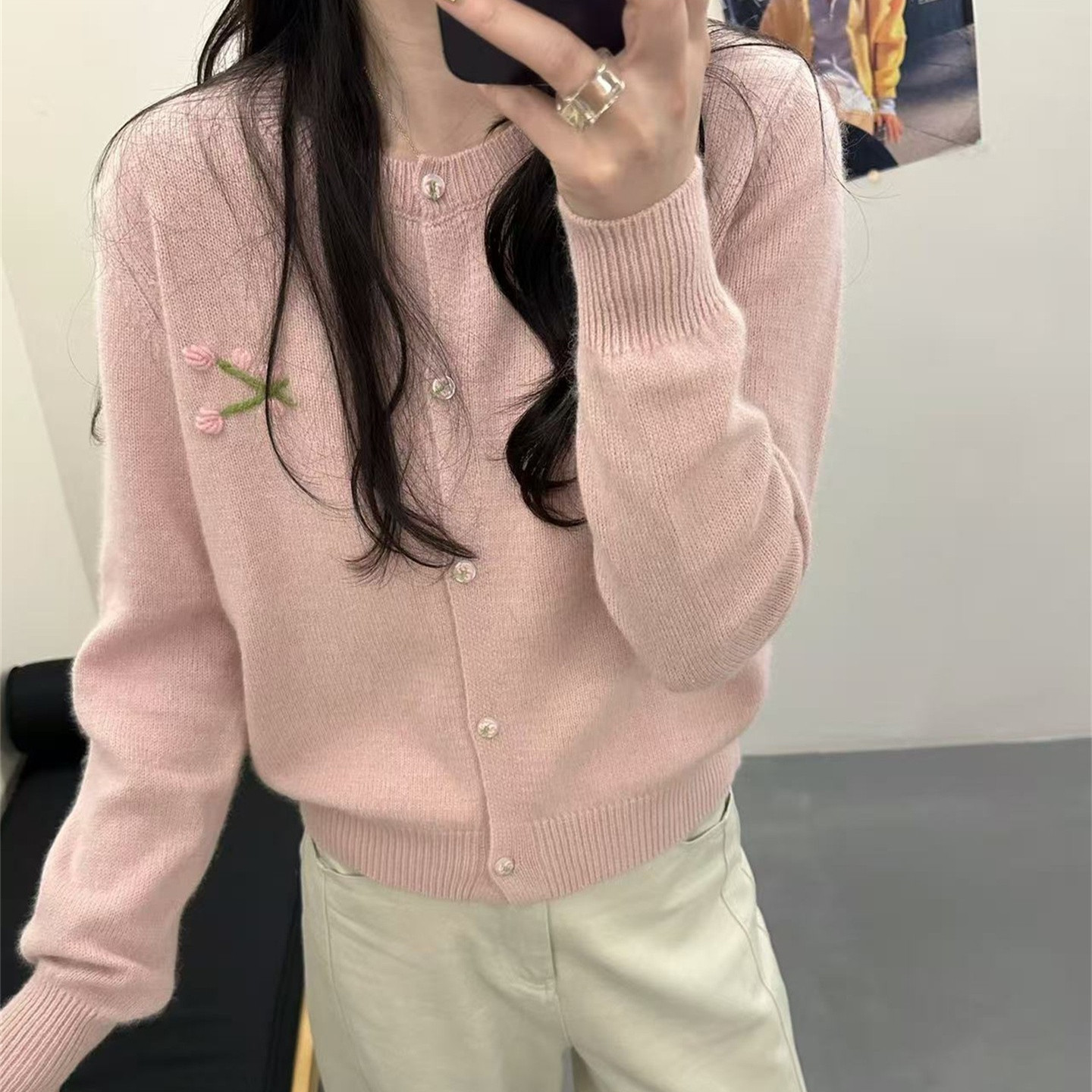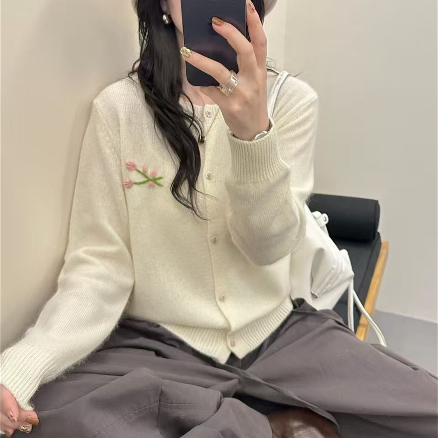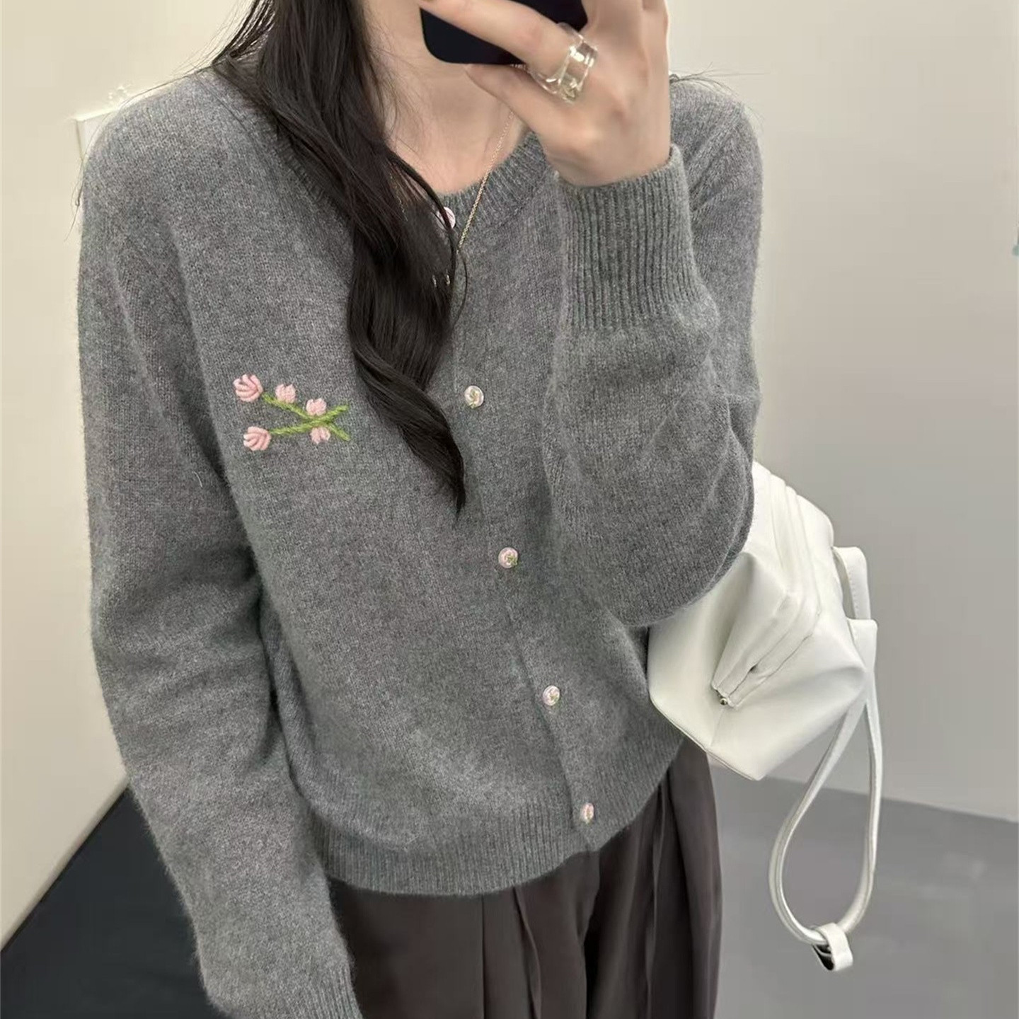 韩版圆领羊毛刺绣花朵针织开衫女2025秋冬新款宽松显瘦软糯毛衣潮