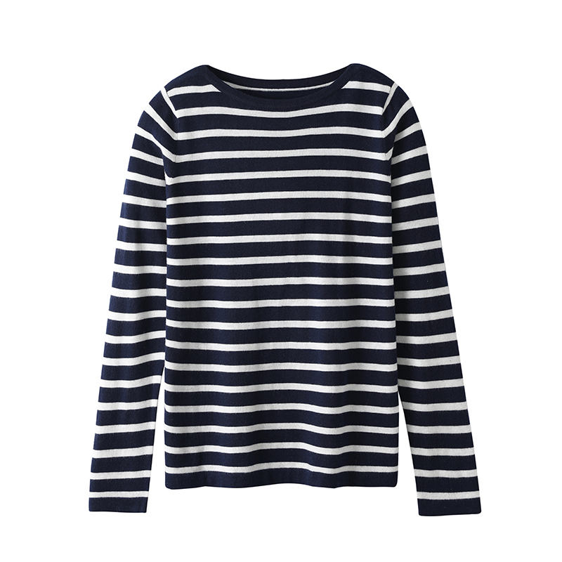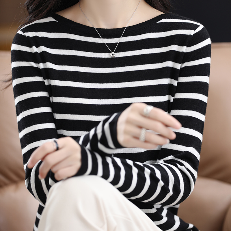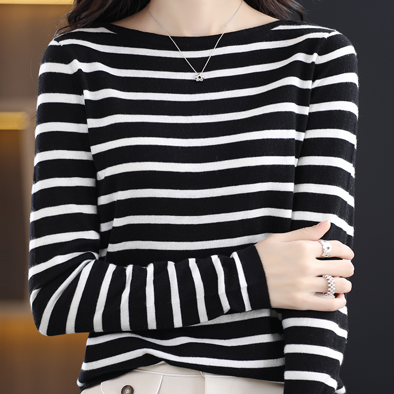 春秋季精纺羊毛衫女一字领条纹针织衫薄款宽松休闲长袖毛衣打底衫