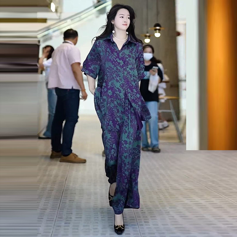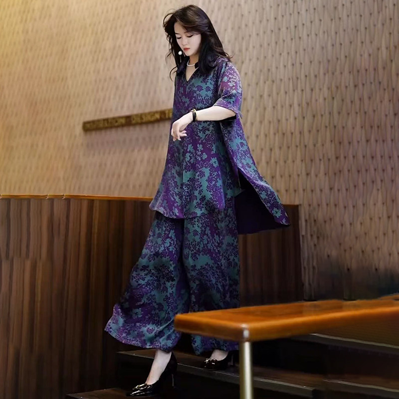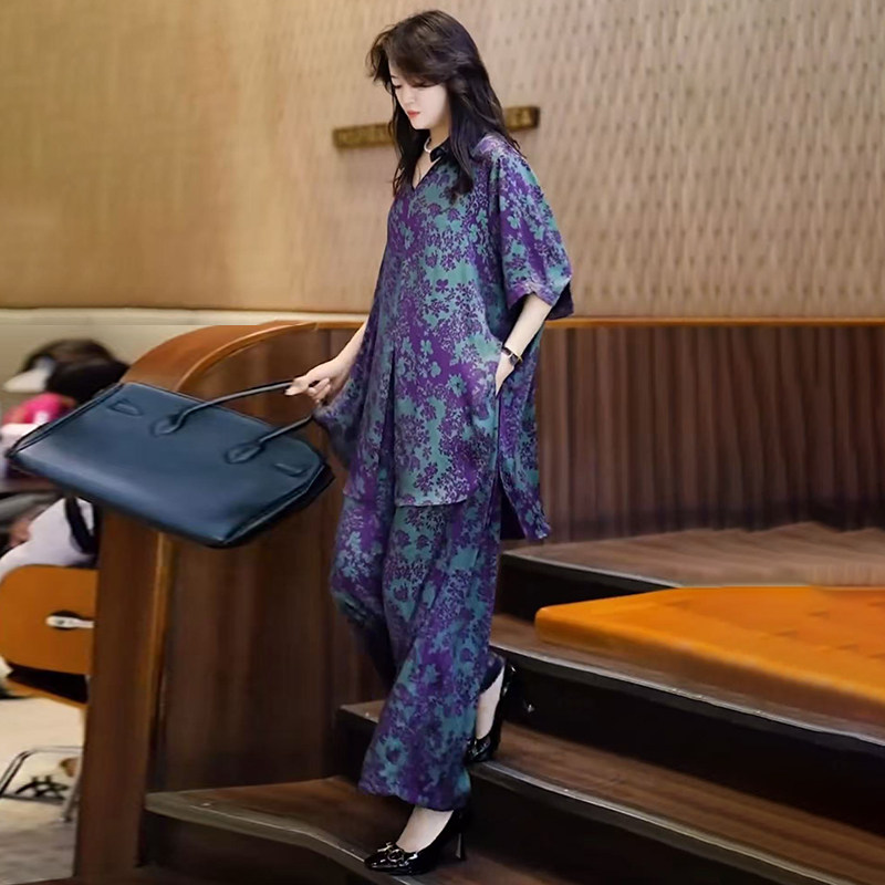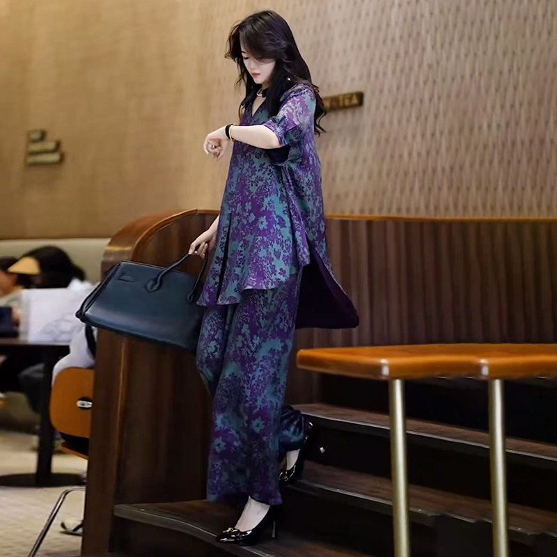 欧货高端夏季真丝套装时尚加肥加大码200斤阔腿裤气质妈妈两件套