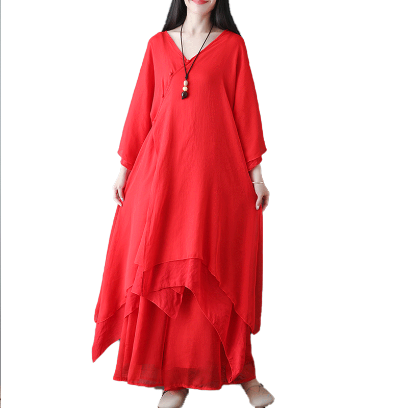 2025夏大码禅服棉麻套装中国风V领休闲连衣裙大码宽松阔腿裤女装