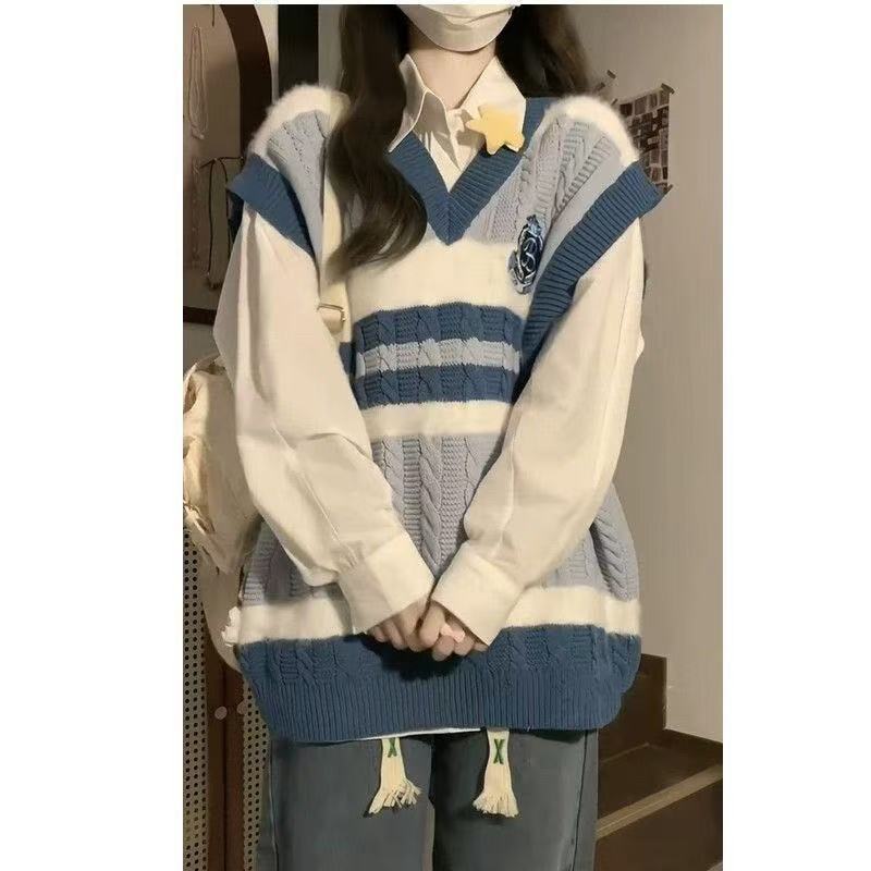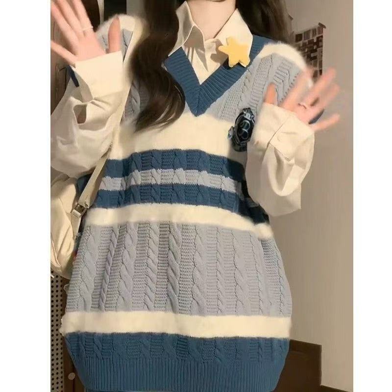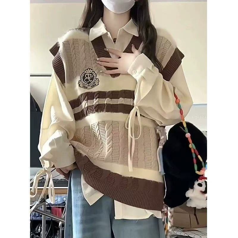韩版学院风两件套套装徽章撞色针织马甲背心搭配学生杏色绑带衬衫