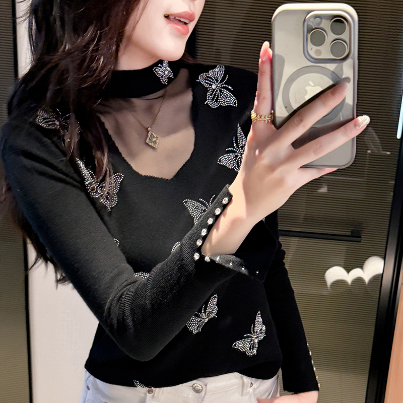 网纱拼接针织衫女长袖秋冬设计感镂空烫钻打底上衣半高领内搭毛衣