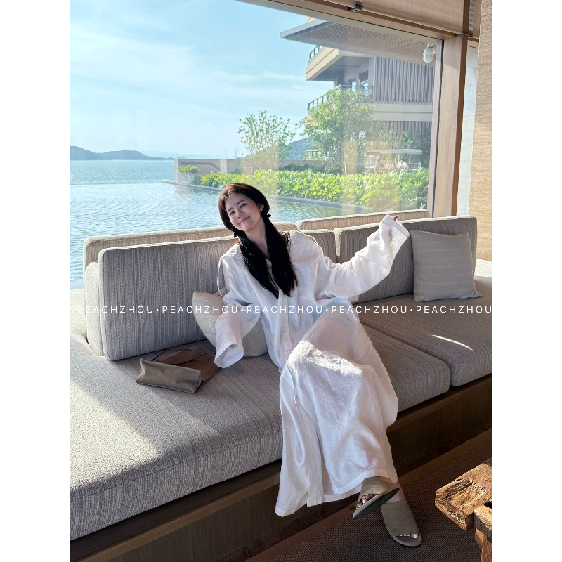 PEACHZHOU 100亚麻简约纯色松弛长款连帽长袖衬衫式早秋防风外套