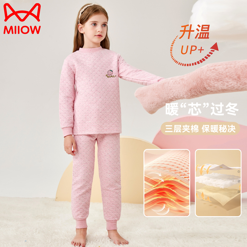 猫人儿童三层夹棉内衣套装纯棉女孩秋衣秋裤男童中大童秋冬保暖套
