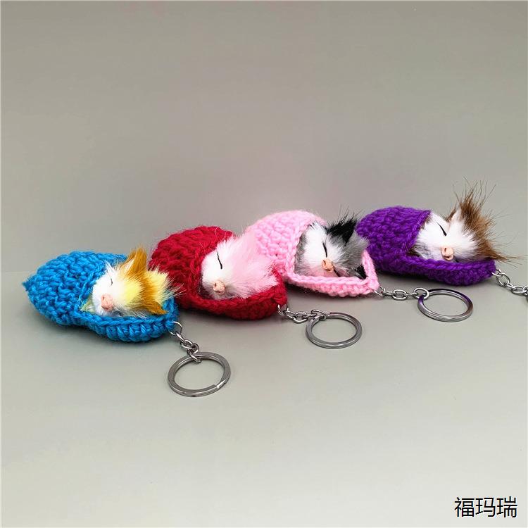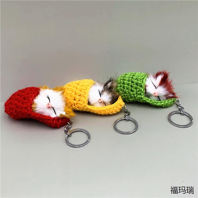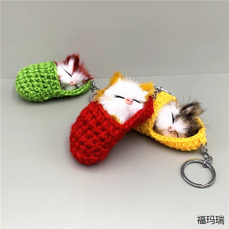 可爱睡眠猫咪钥匙扣拖鞋猫毛绒包包挂件汽车钥匙链仿真动物小礼品