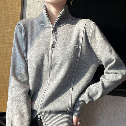 灰色双拉链高领针织衫开衫运动短款洋气上衣小个子秋季毛衣外套女