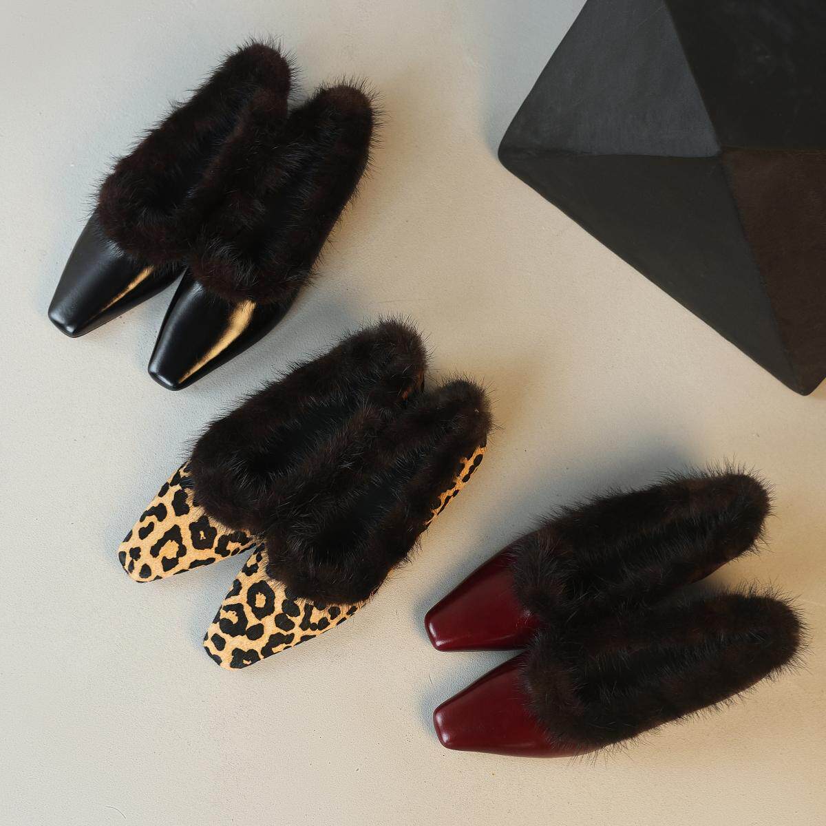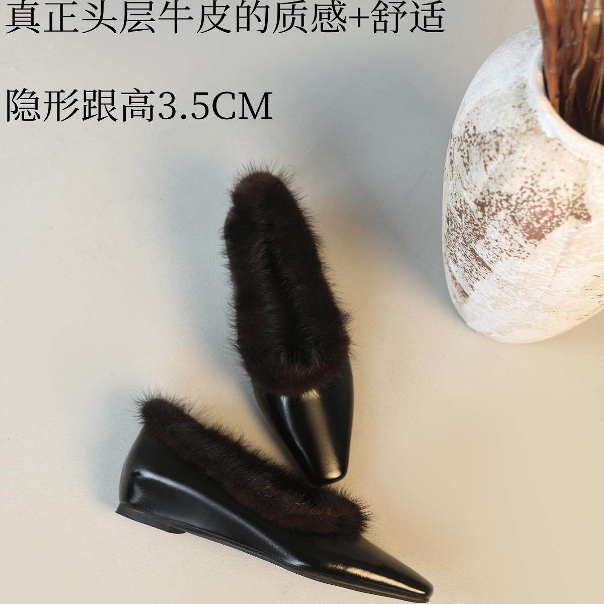 MIA水貂毛 X真牛皮毛毛单鞋3CM坡跟内增高法式气质韩版2024年冬季