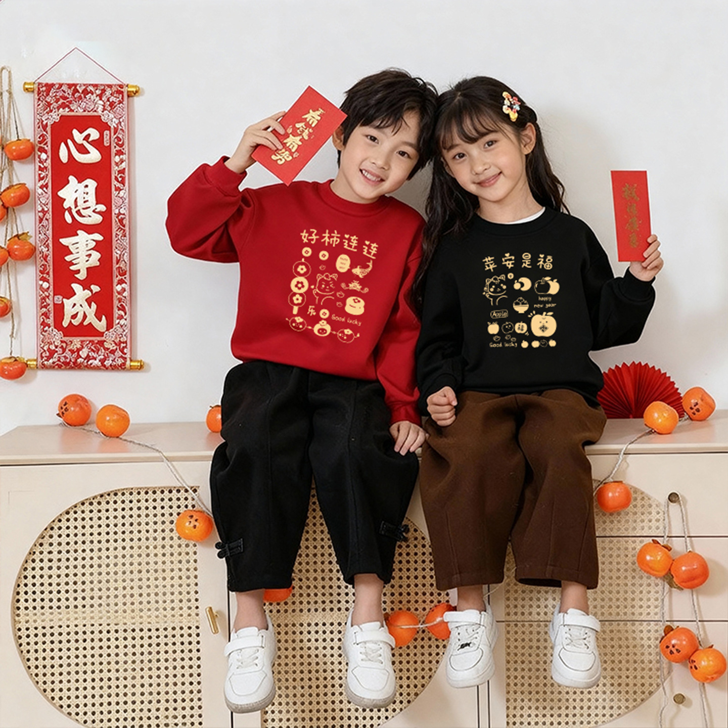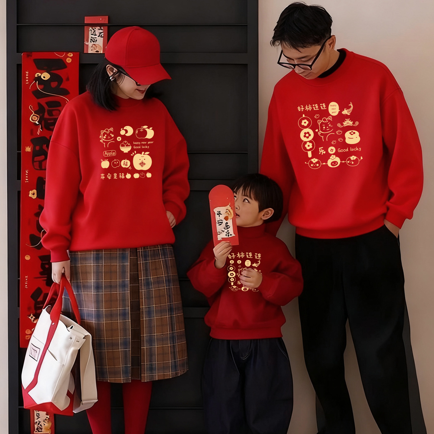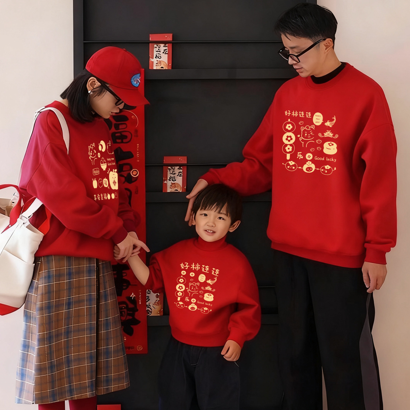 新年亲子装加绒加厚红色卫衣好柿连连卡通印花全家款喜庆拍照上衣