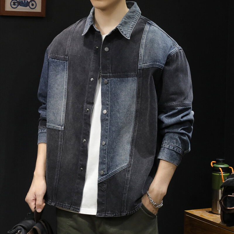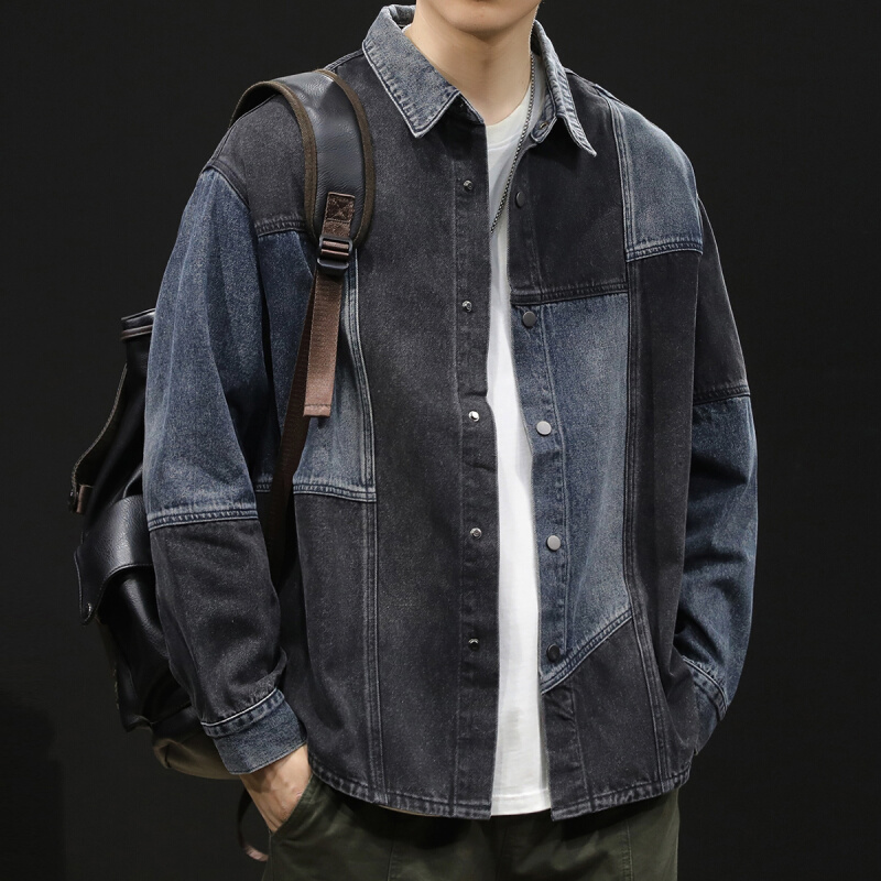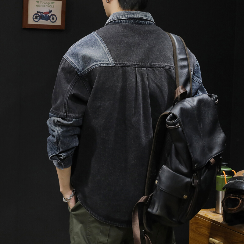 蓝黑拼接潮牌男款衬衣外套男士春秋上衣牛仔衬衫男长袖2024新款