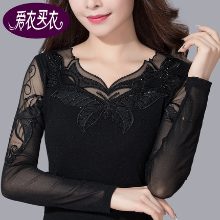 春秋新款网纱打底衫女长袖薄款T恤修身百搭V领蕾丝打底衫内搭小衫