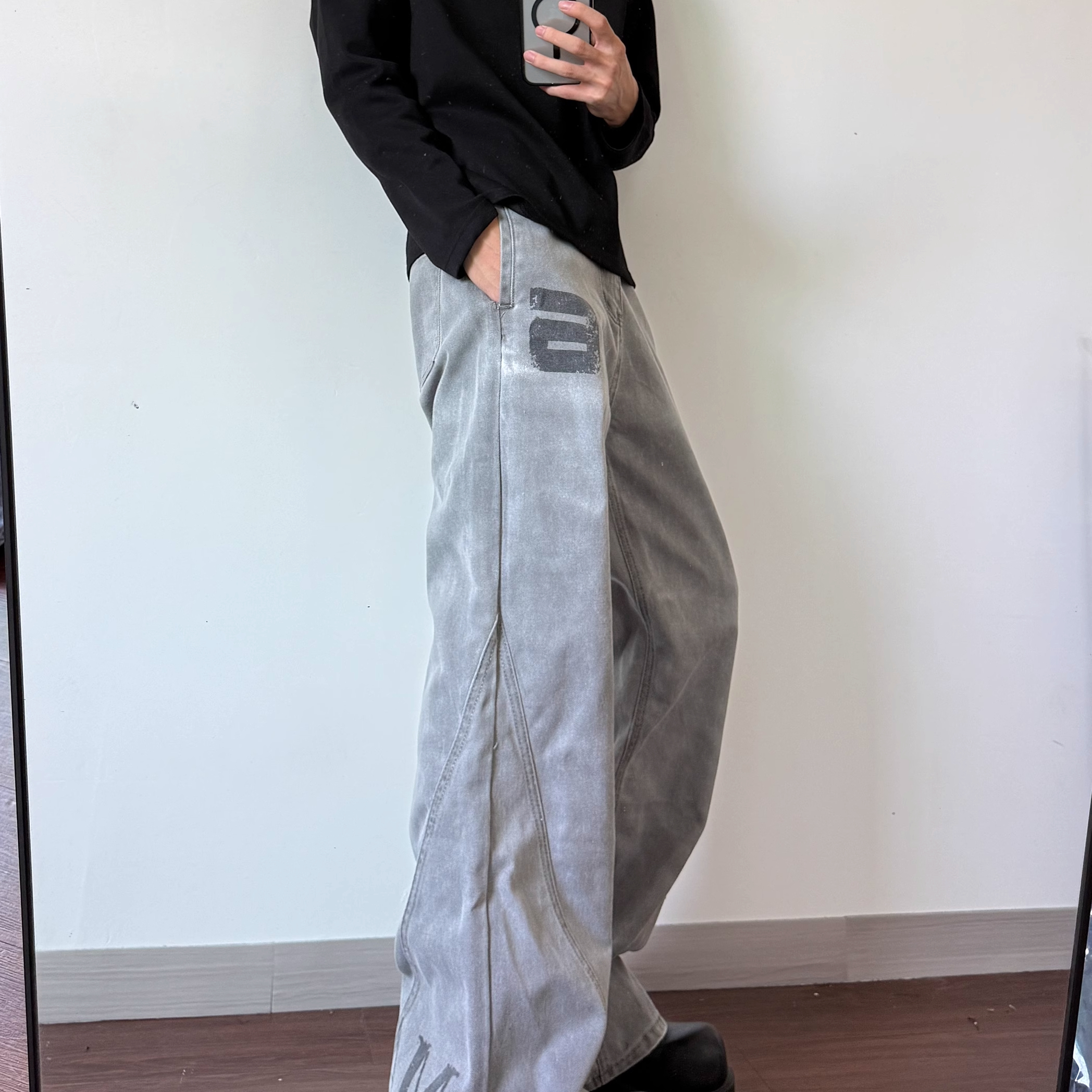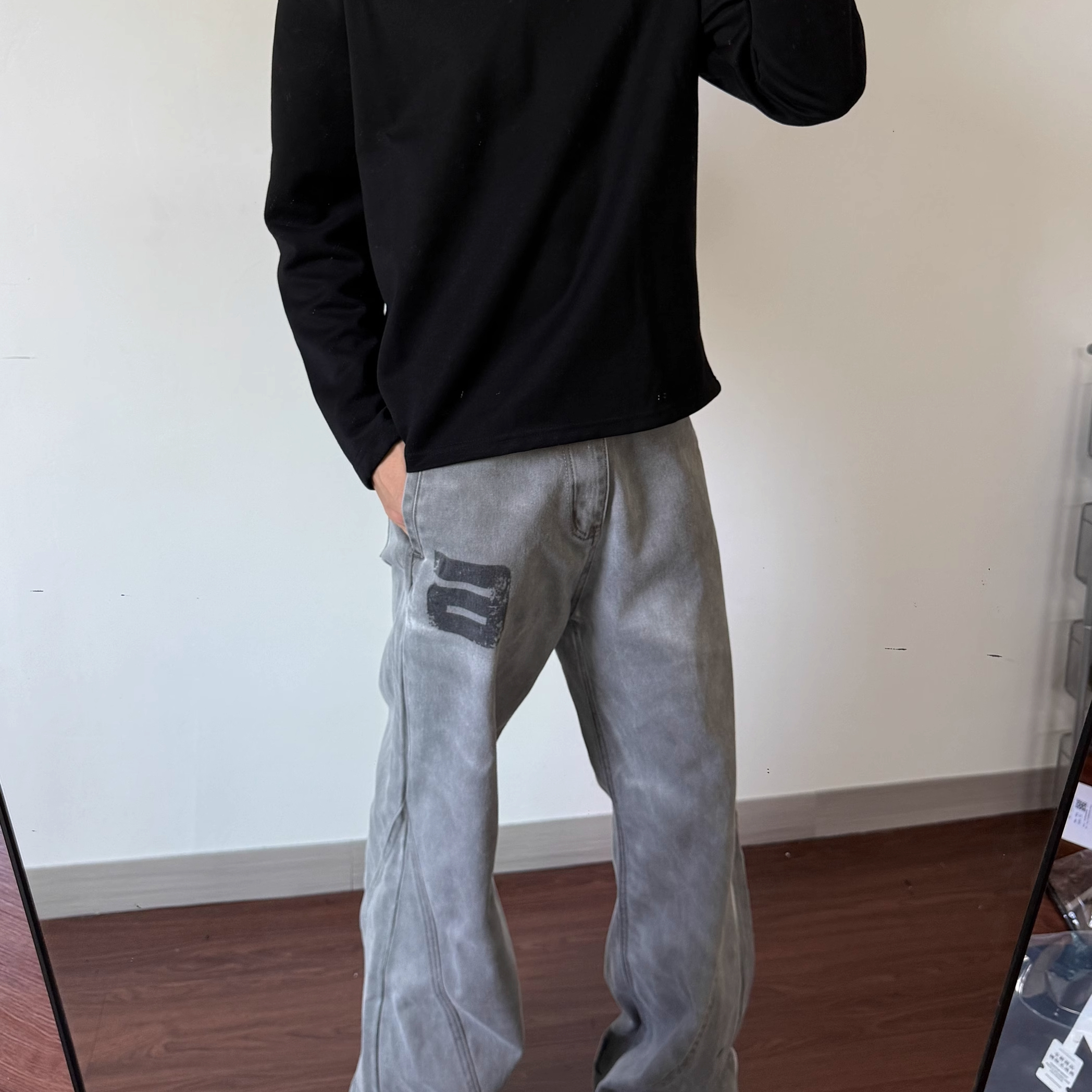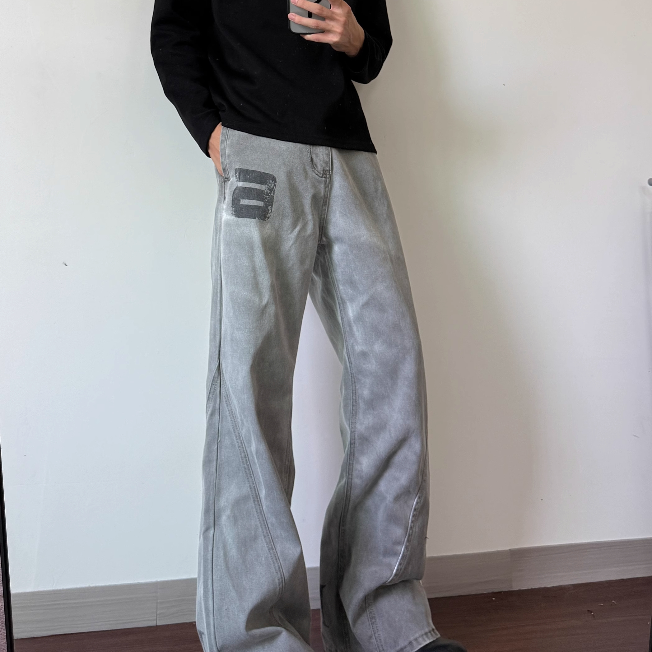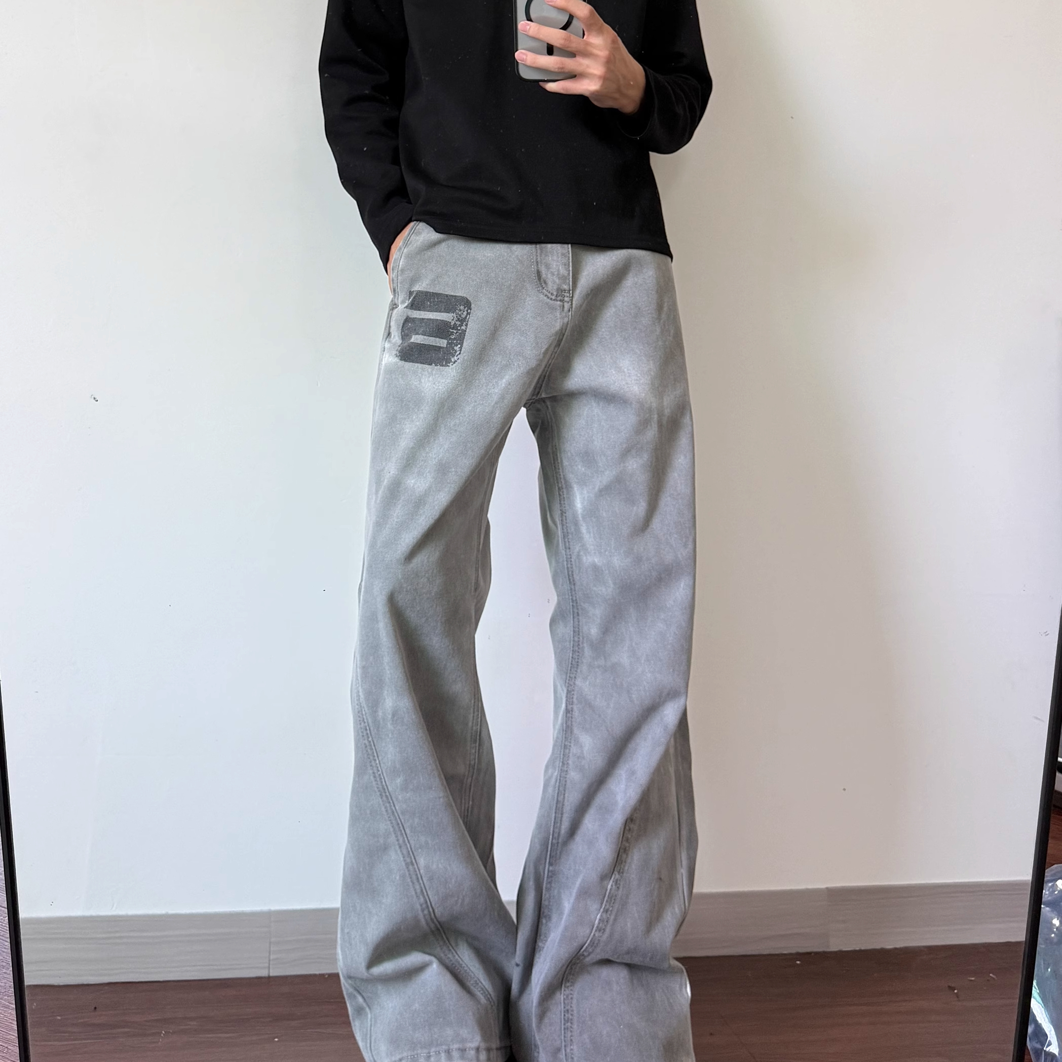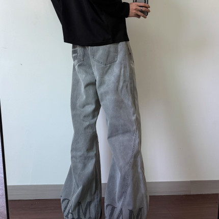 美式复古水洗做旧印花微喇牛仔裤男女cleanfit宽松休闲拖地长裤子