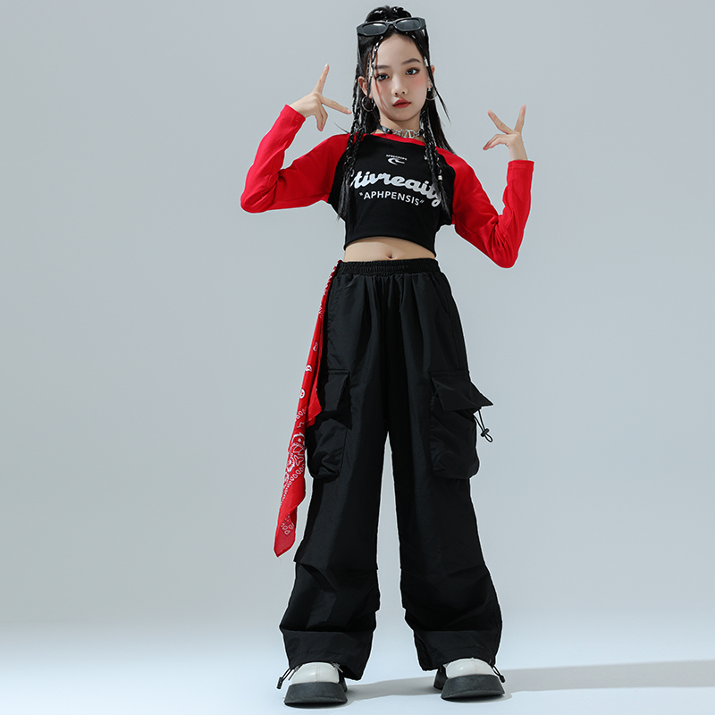 女童爵士舞服装jazz练功服露脐长袖走秀潮衣表演出服工装裤套装秋