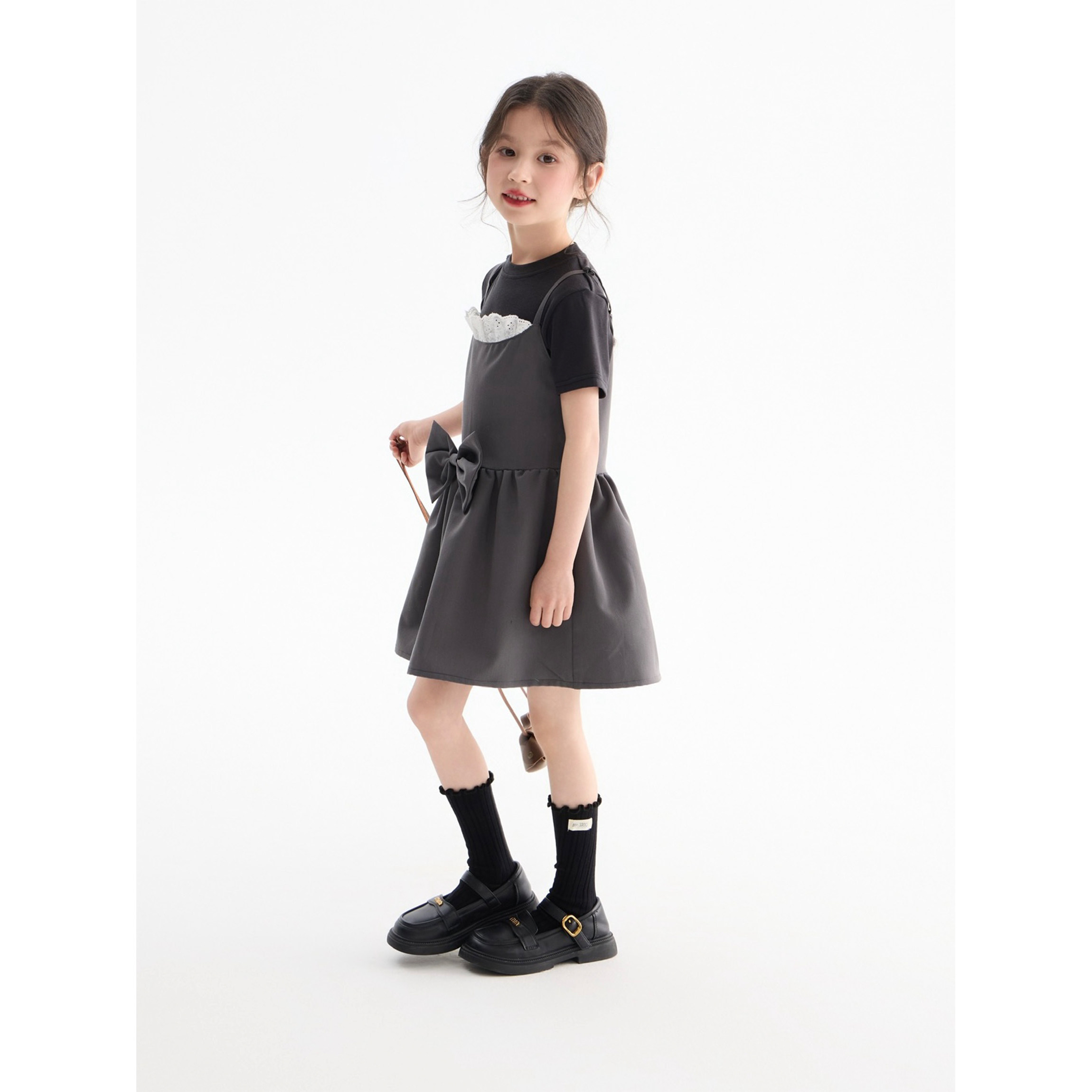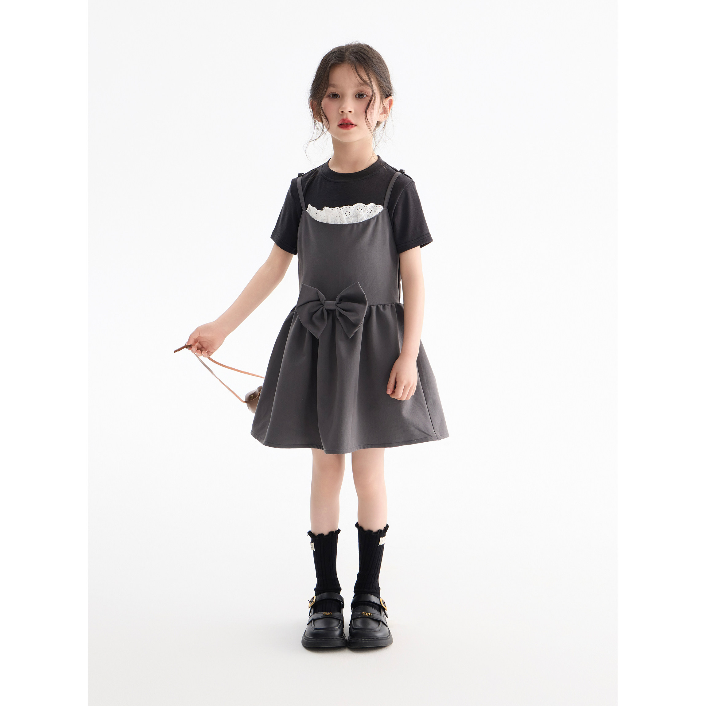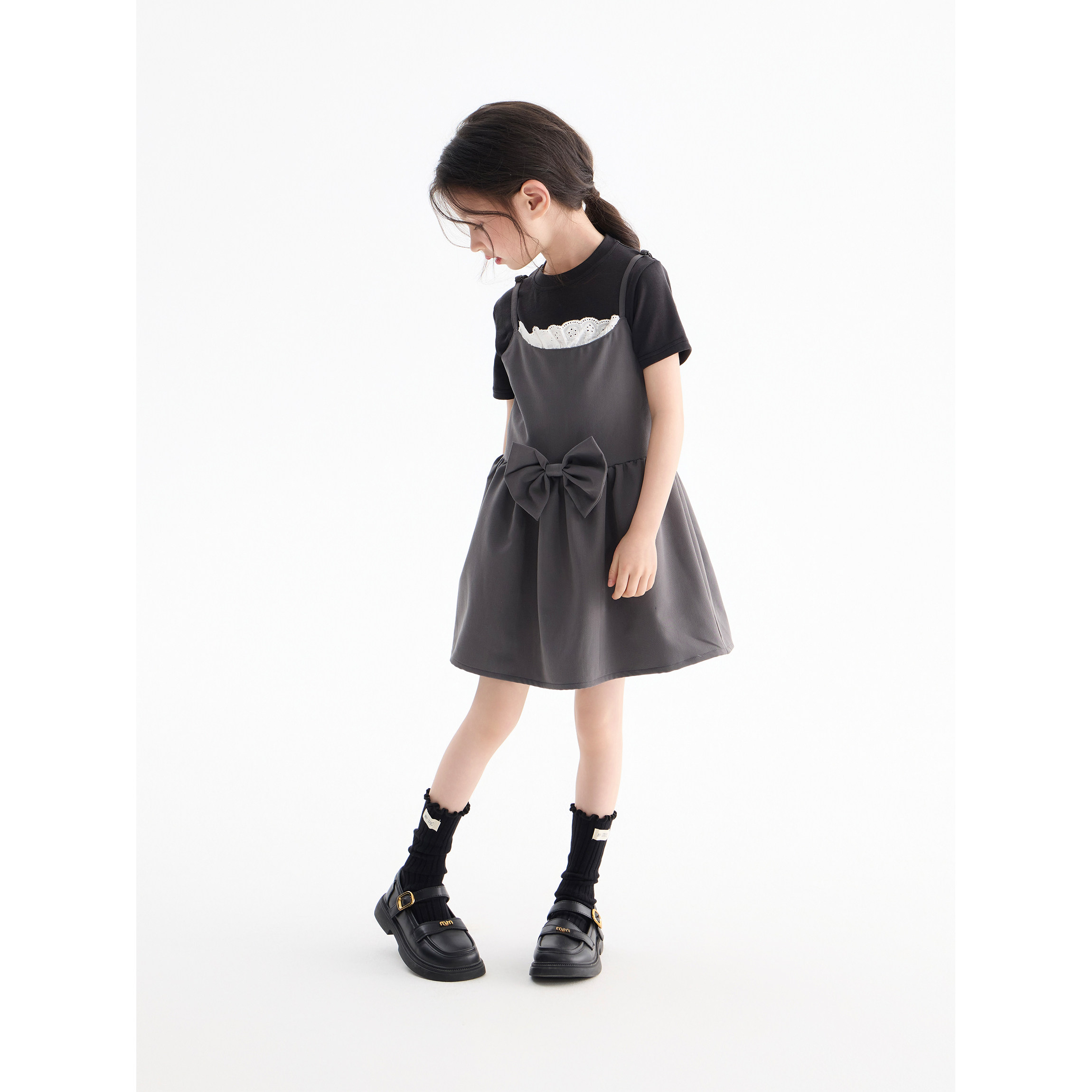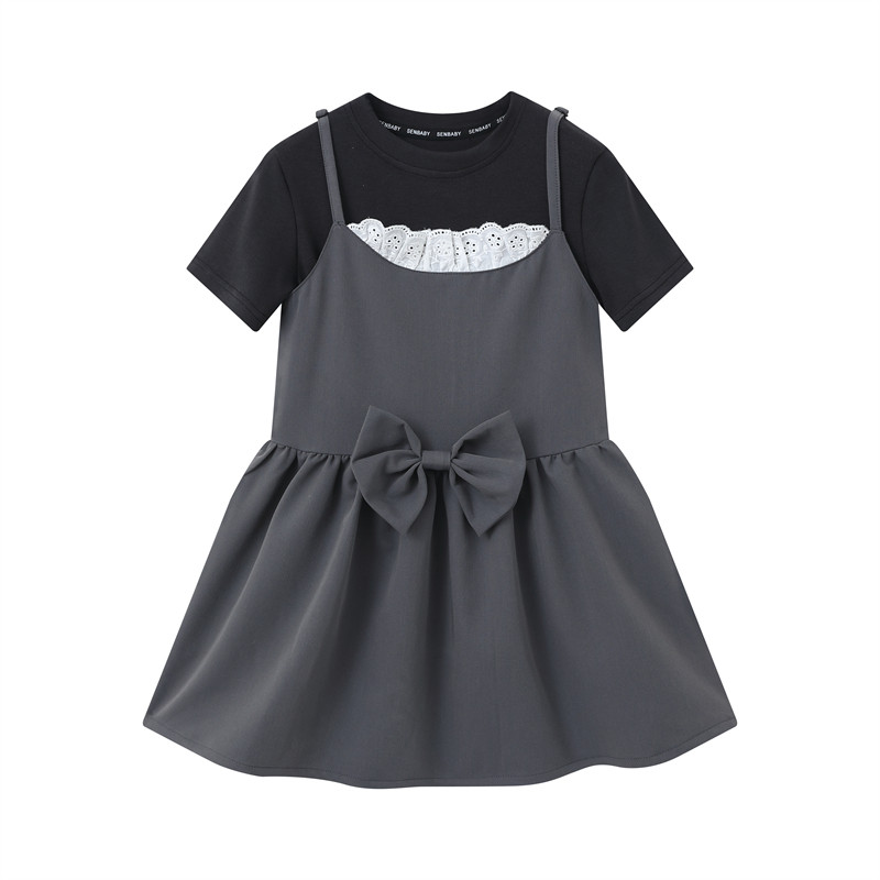 senbaby童装女童春夏西装吊带连衣裙蝴蝶结蕾丝背带裙+短袖T恤