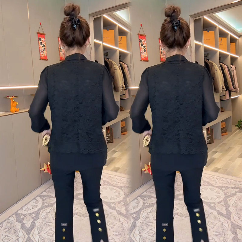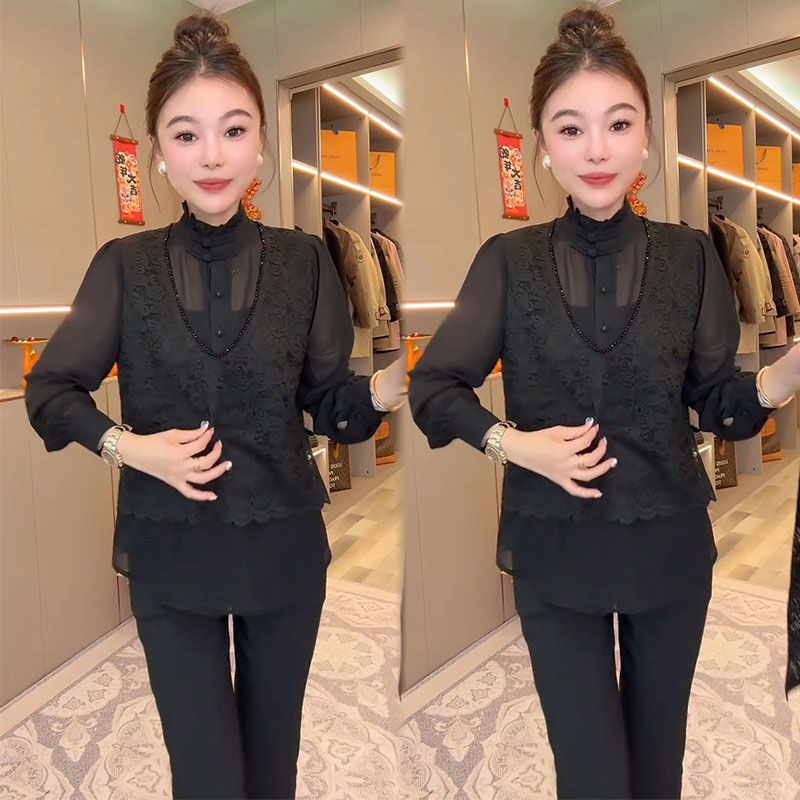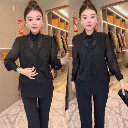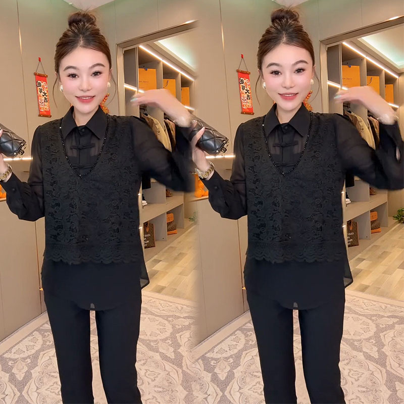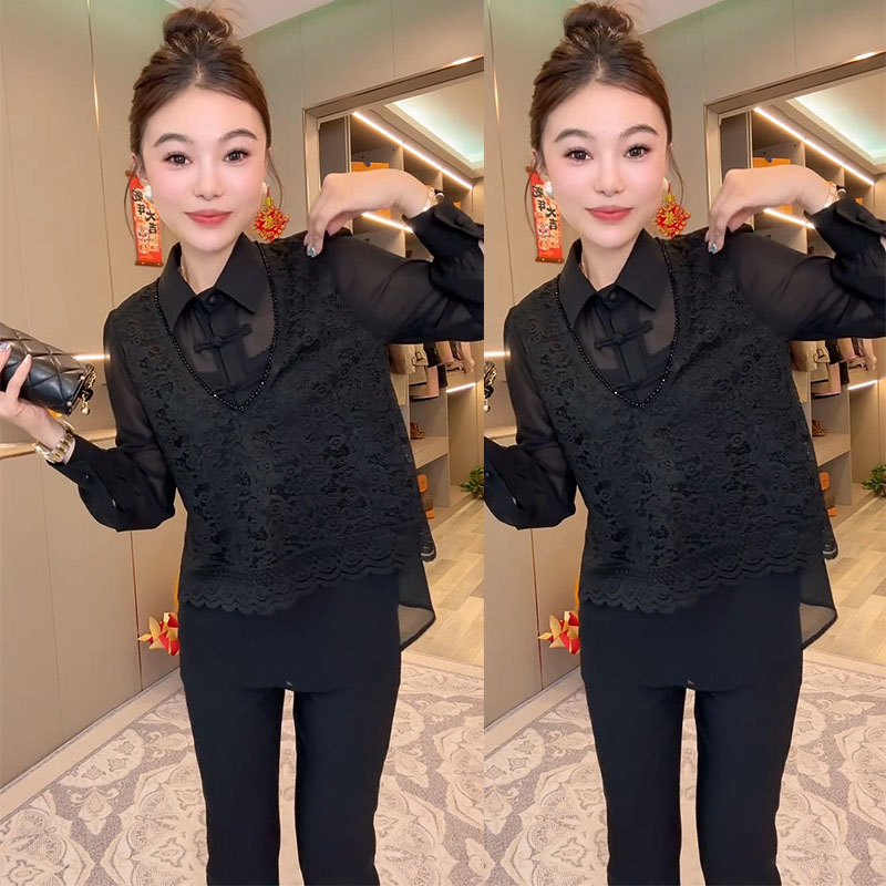 新中式高级感衬衫女2025春季洋气设计感蕾丝盘扣拼接假两件雪纺衫