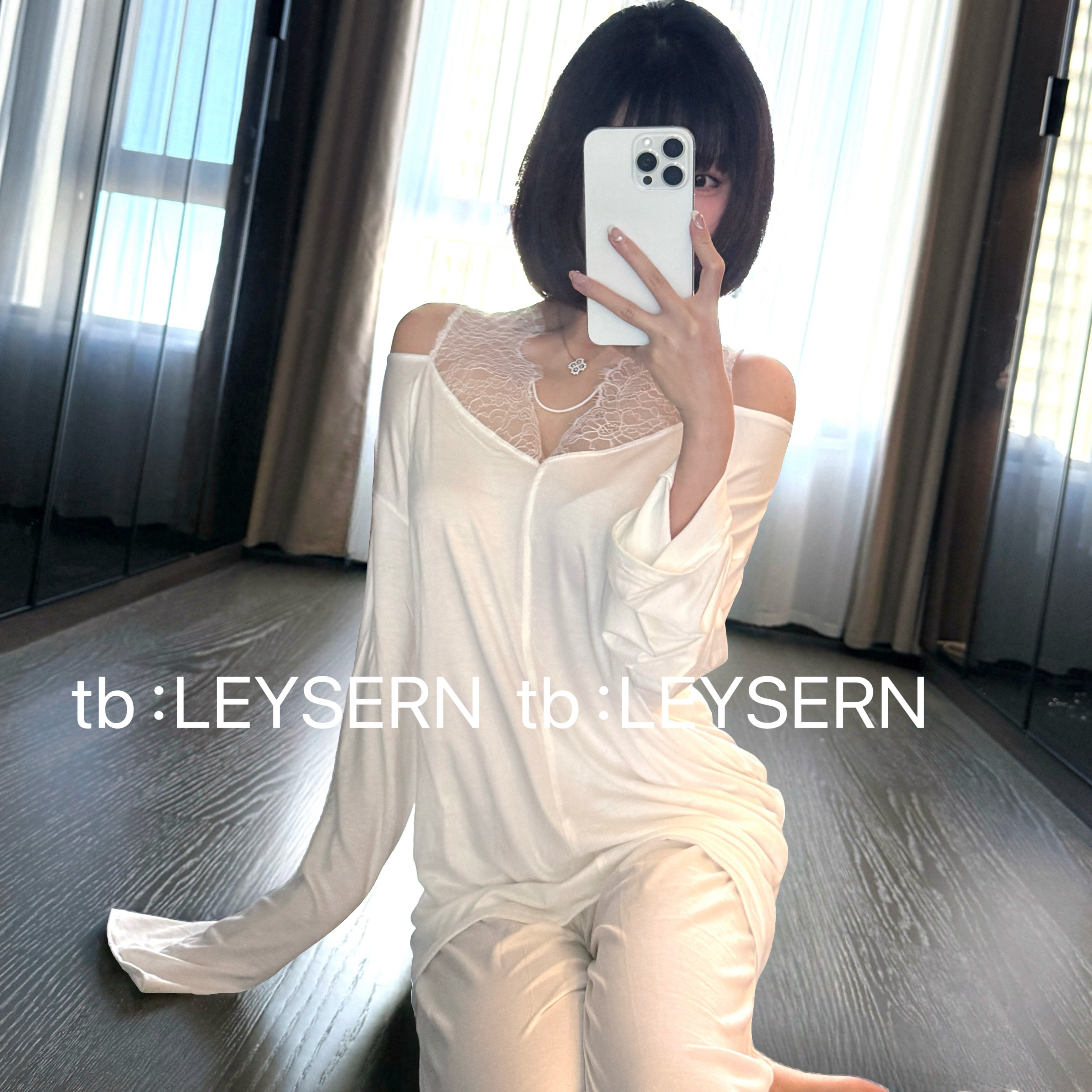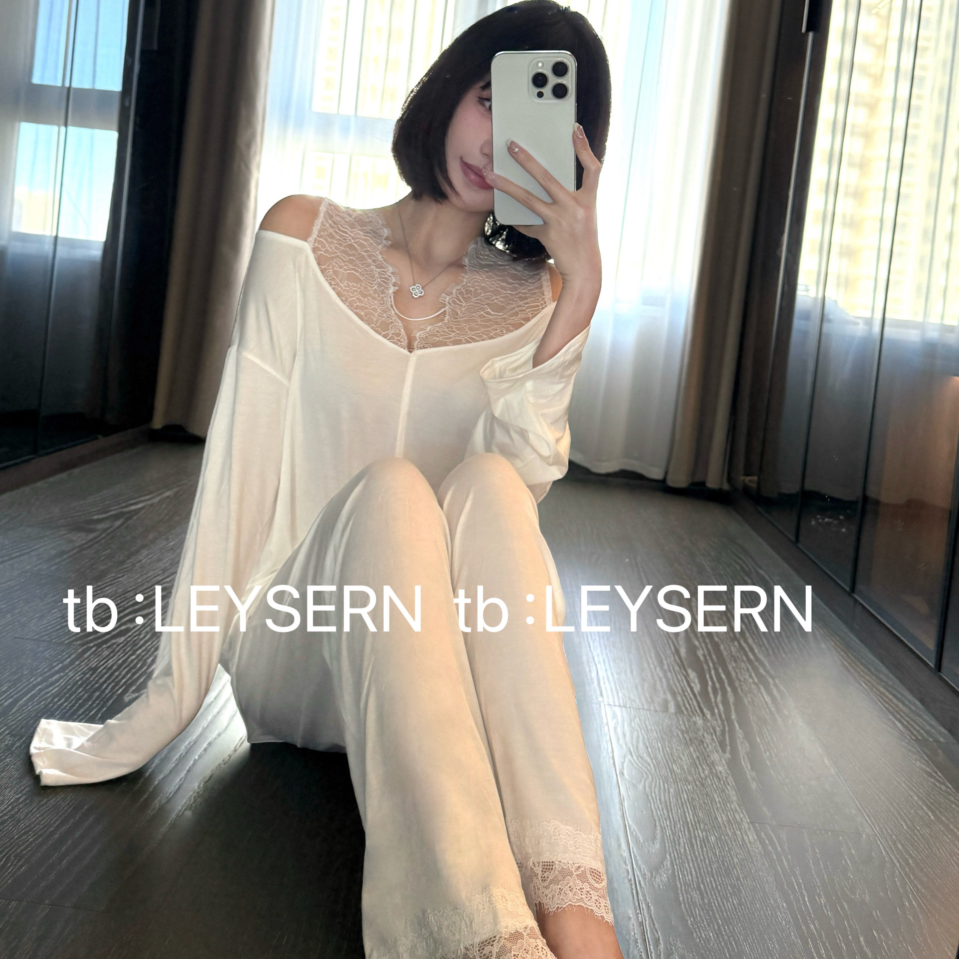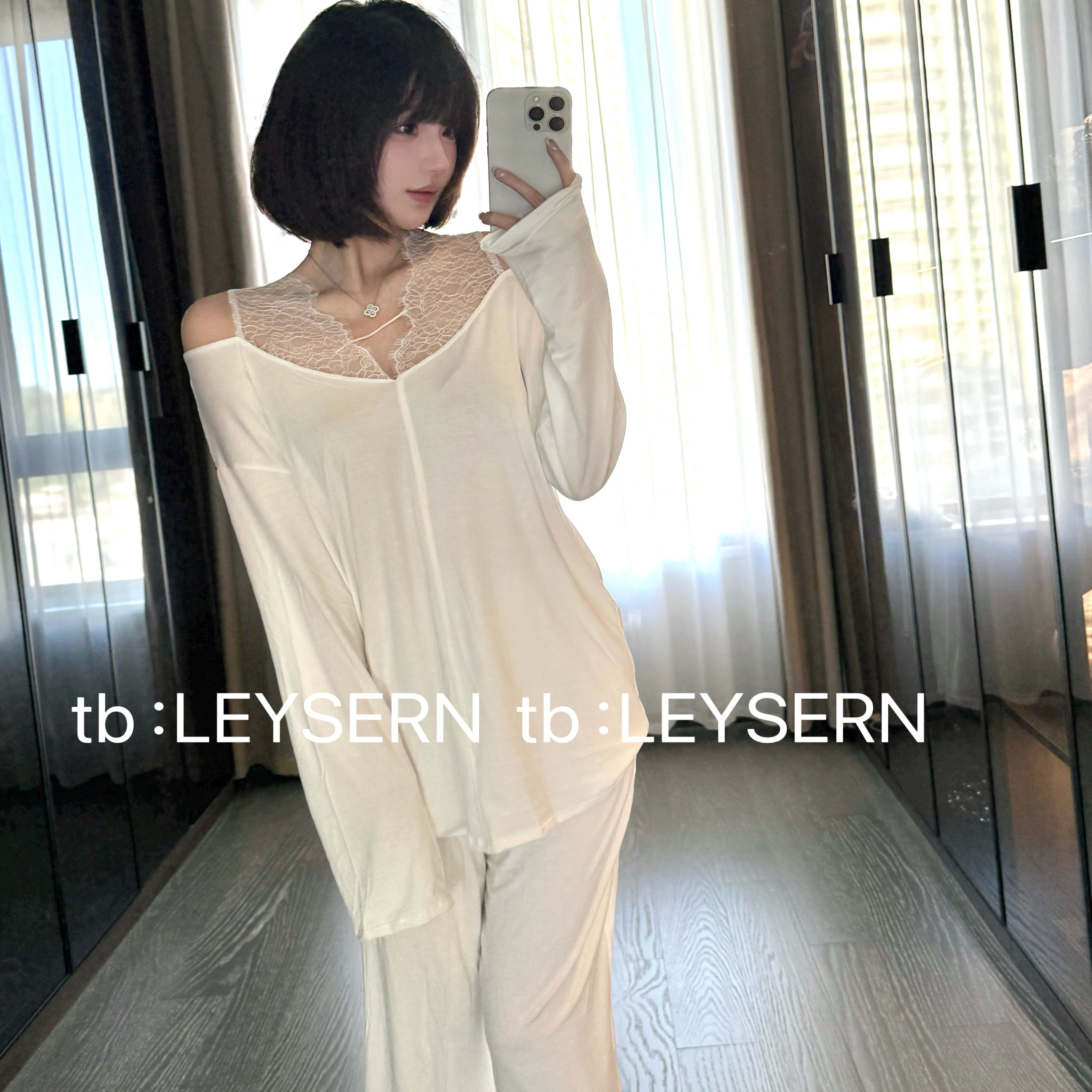 LEYSERN性感宽松斜肩蕾丝莫代尔女士舒适长袖裤睡衣V领家居服套装