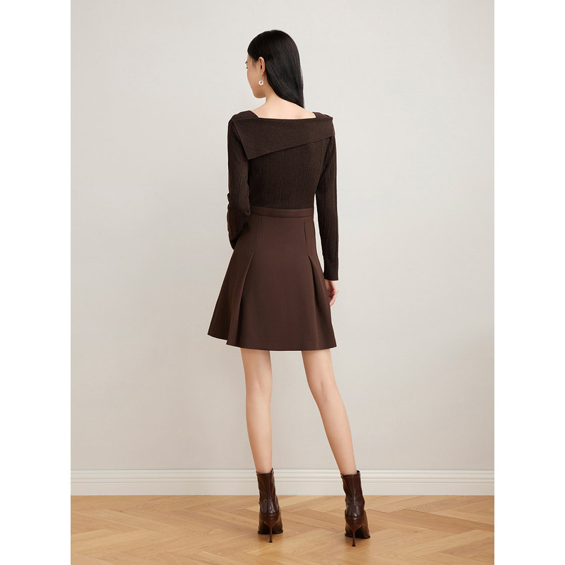 Goodland美地咖色一字领拼接针织连衣裙收腰短款a字裙LC34506427