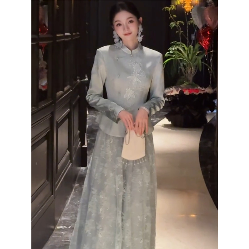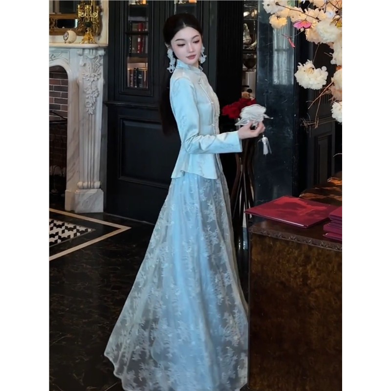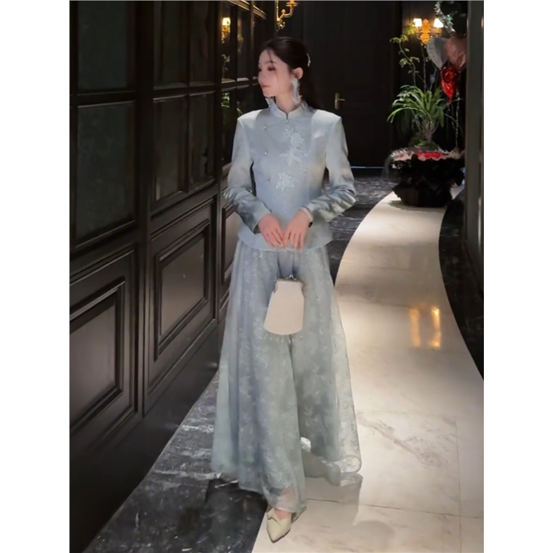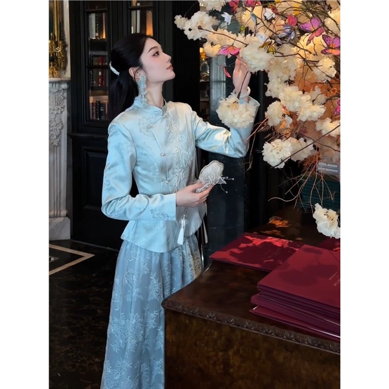 秋季贵气感穿搭名媛气质轻奢女神范新中式国风蓝色盘扣连衣裙套装