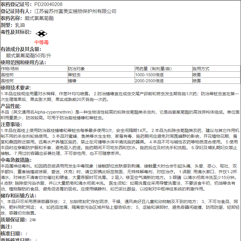 富美实盲蝽蟓杀虫剂氯氰菊酯