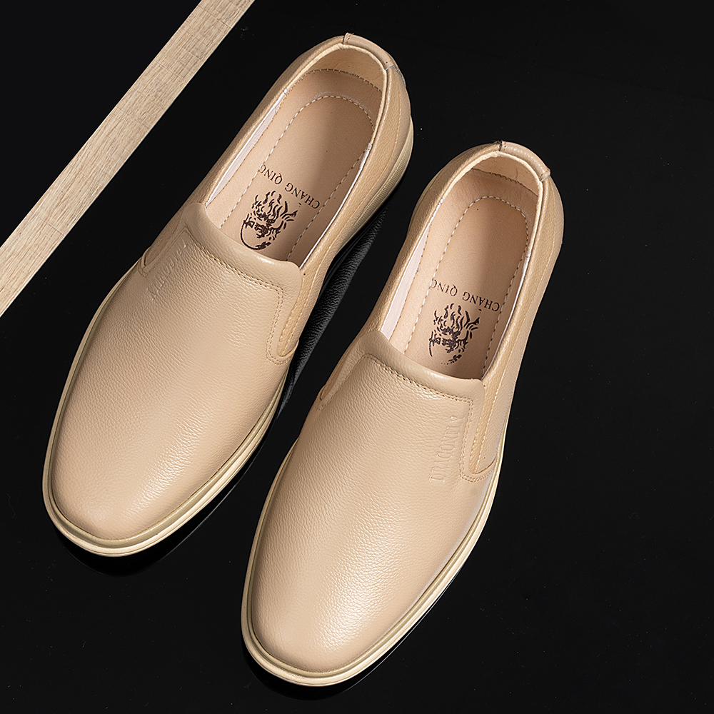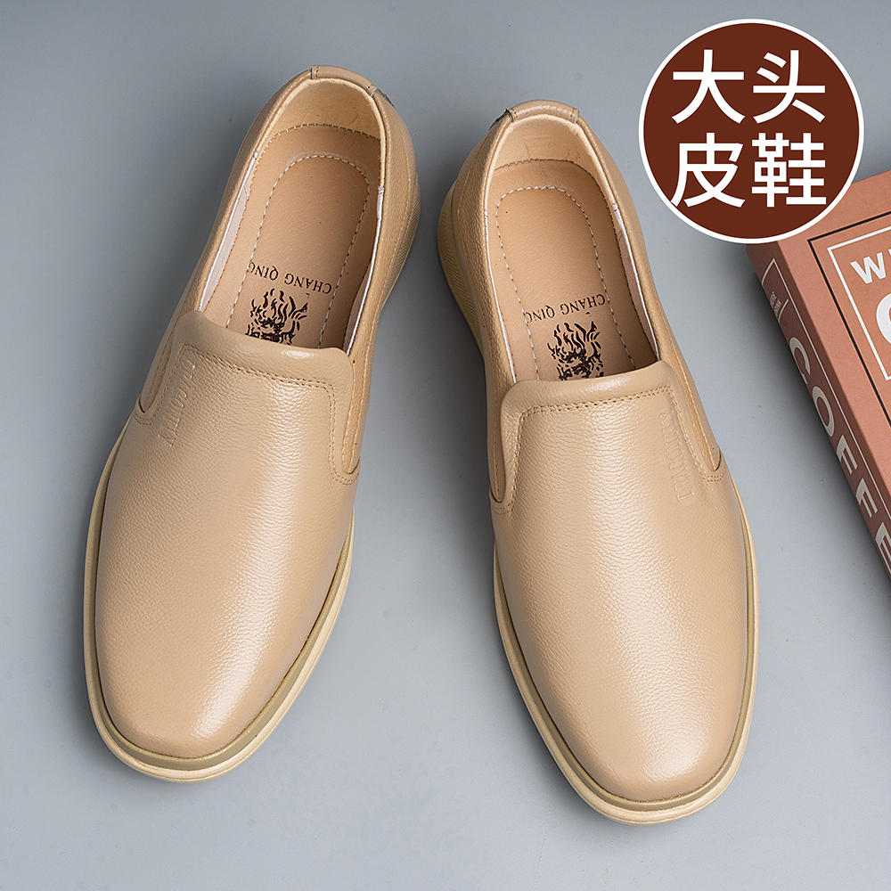 进口真皮休闲软皮软底加肥加宽大头皮鞋米黄色皮鞋男米白色爸爸鞋