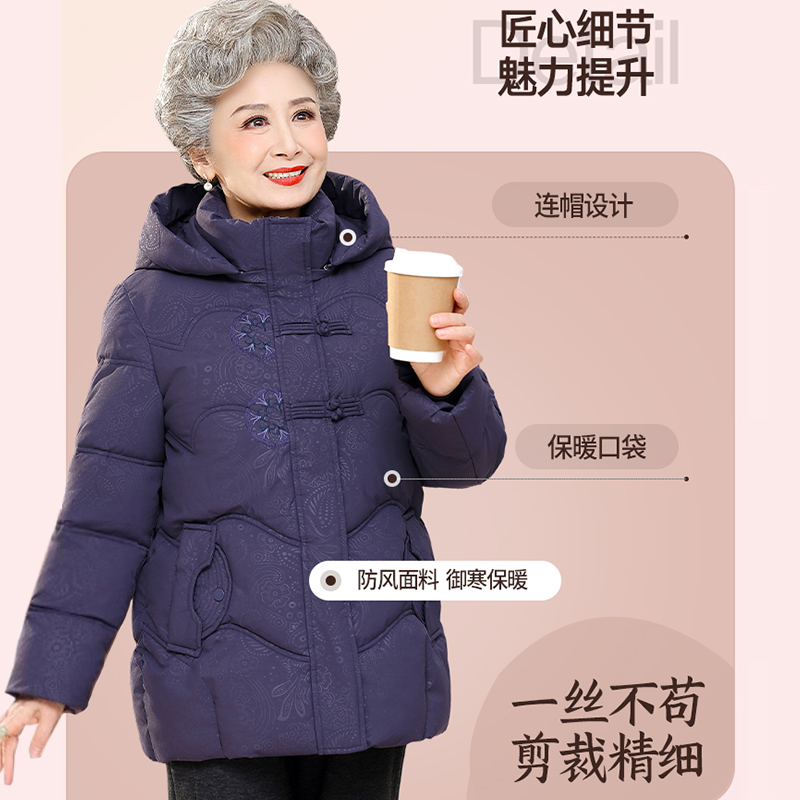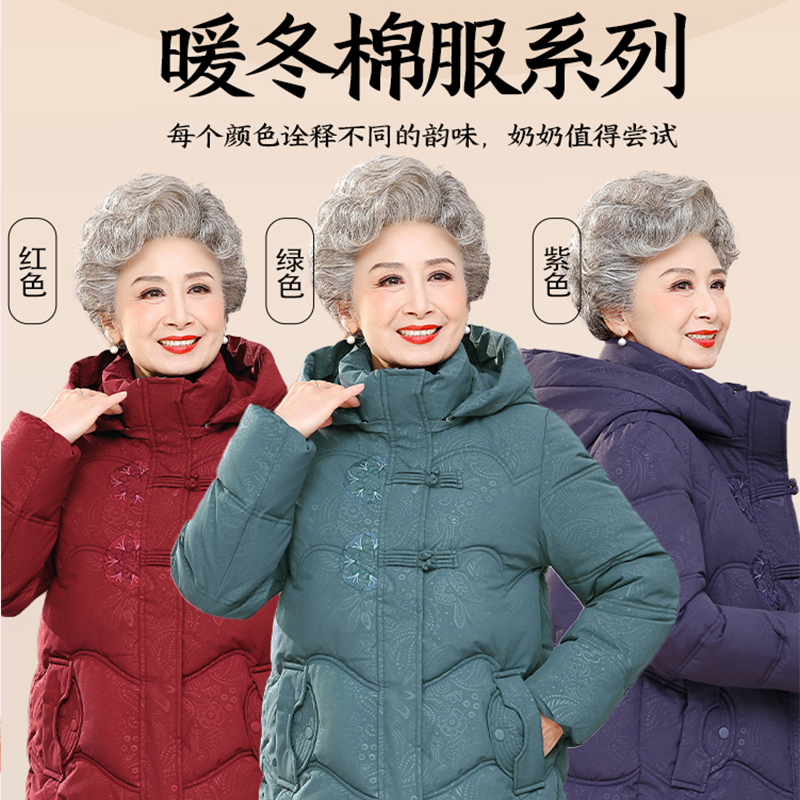 奶奶冬季加绒加厚连帽棉服外套中老年人女款棉袄妈妈装羽绒棉衣服