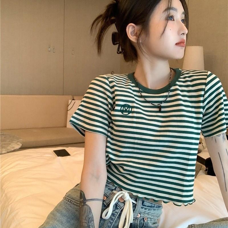百搭条纹短袖t恤女ins潮夏季2025新款韩版设计感修身短款学生上衣