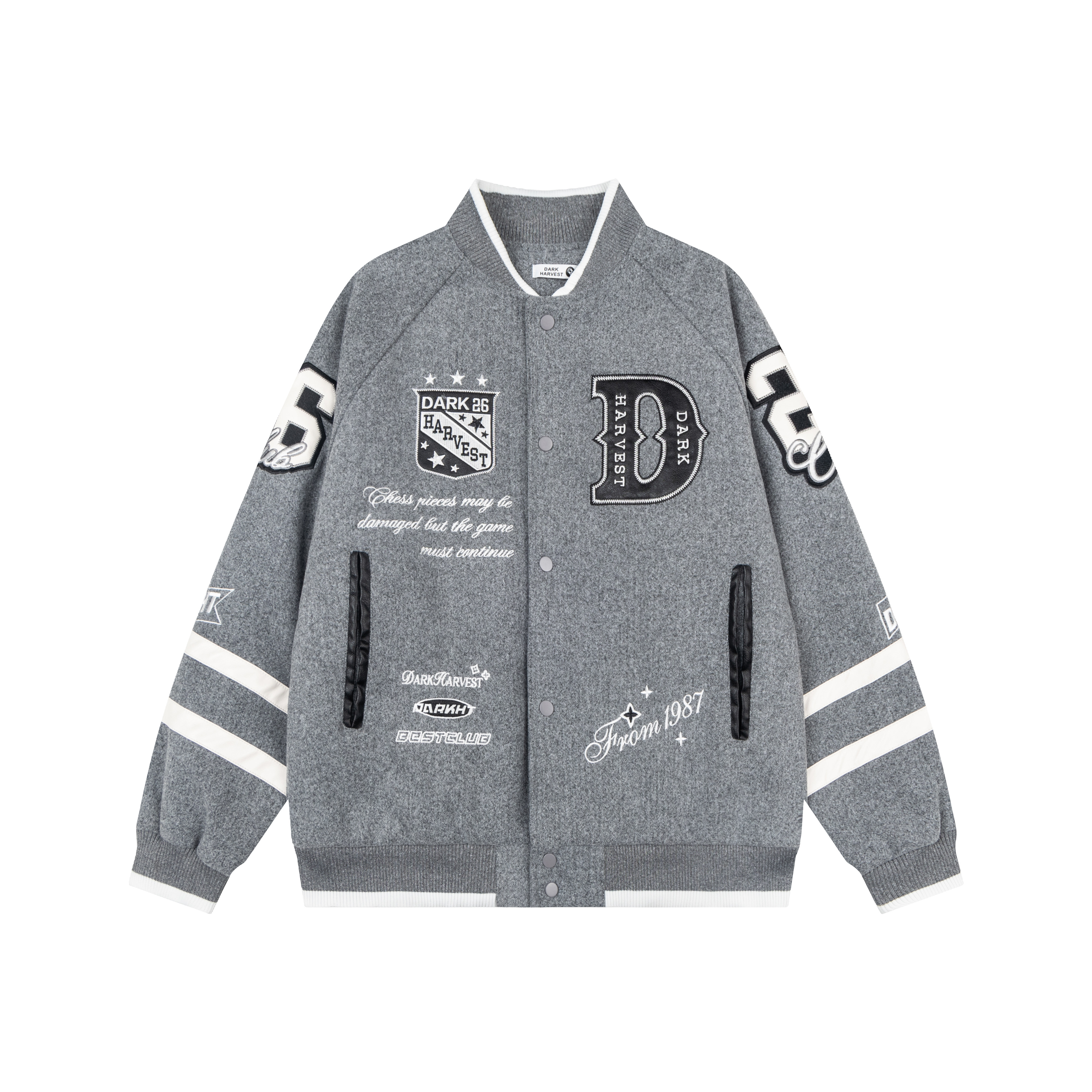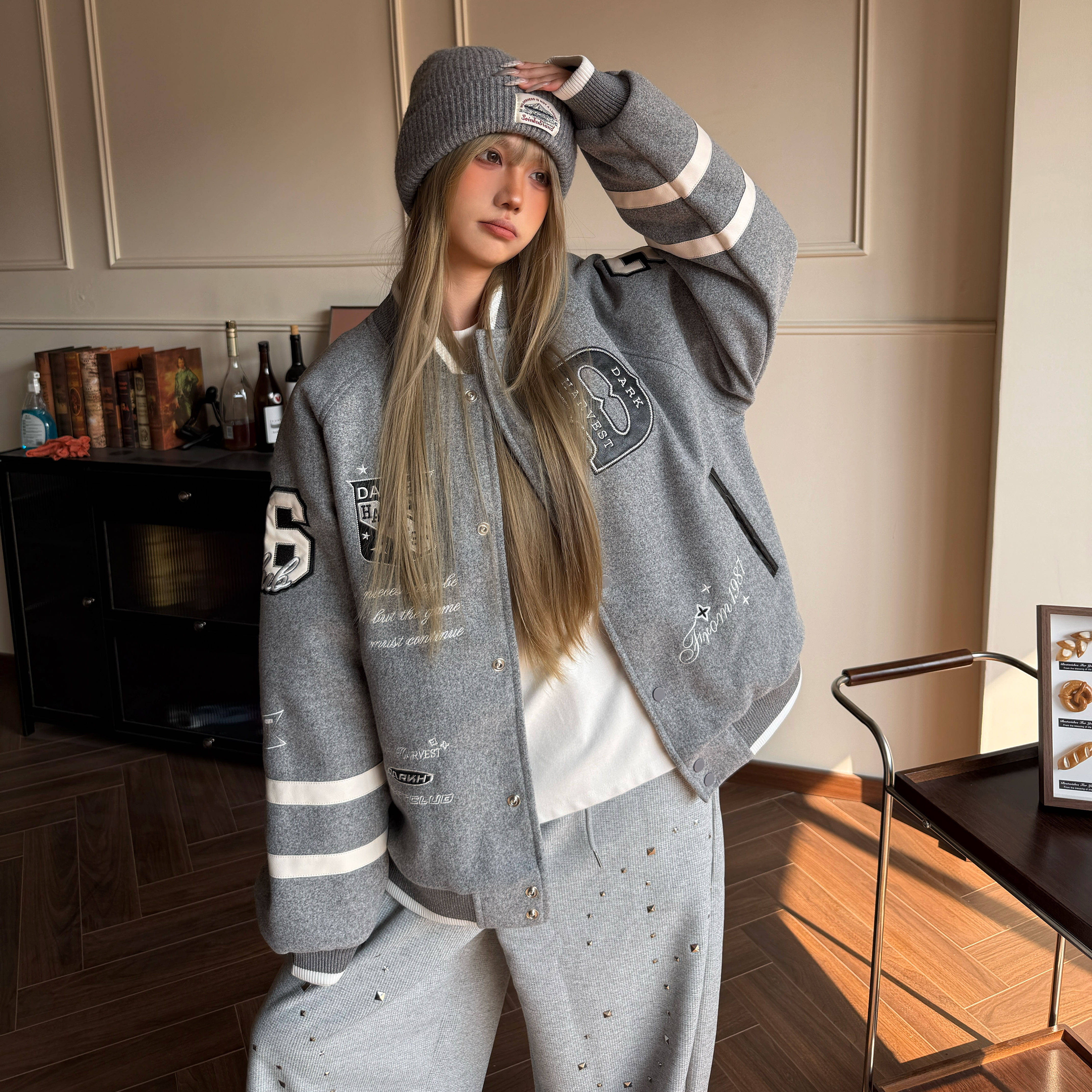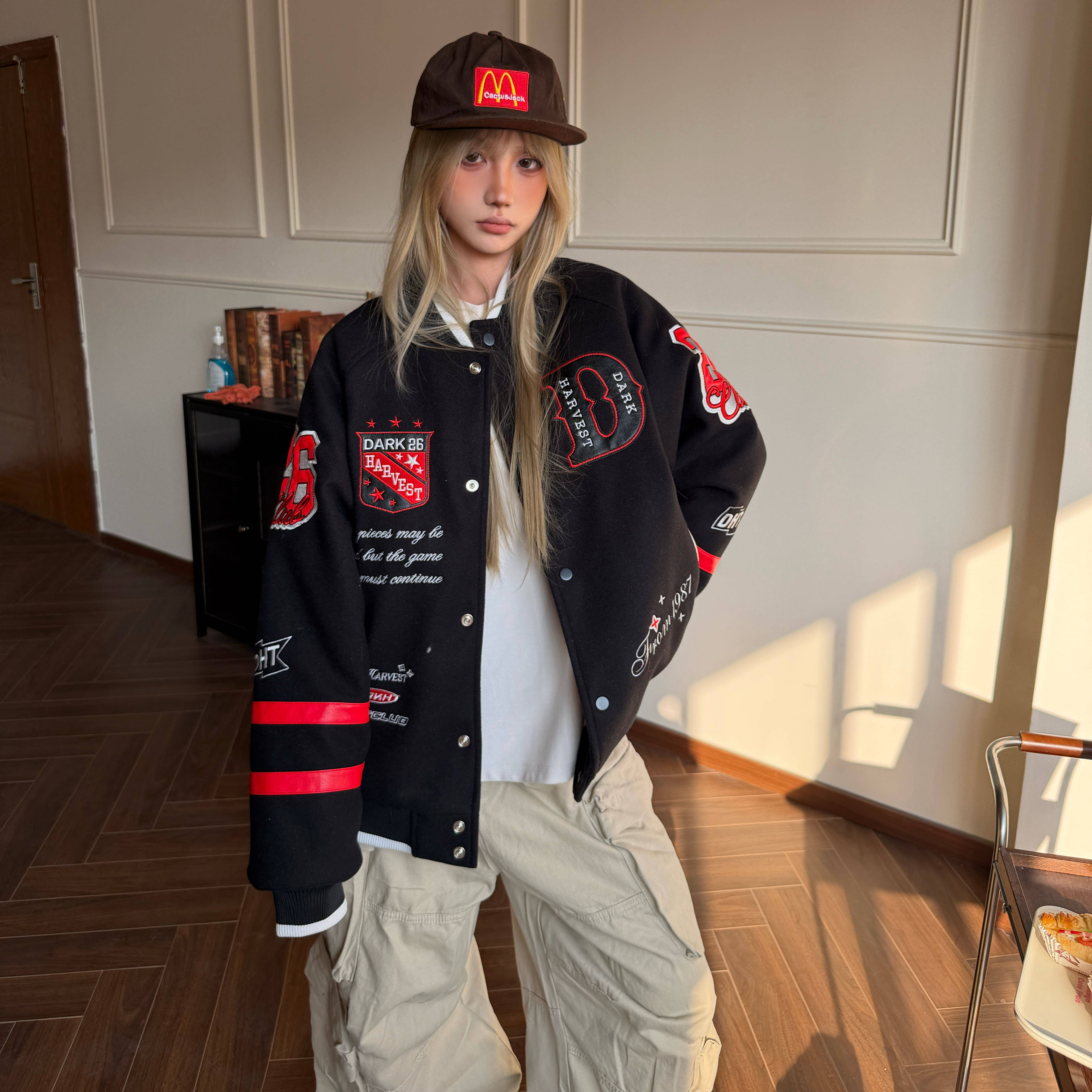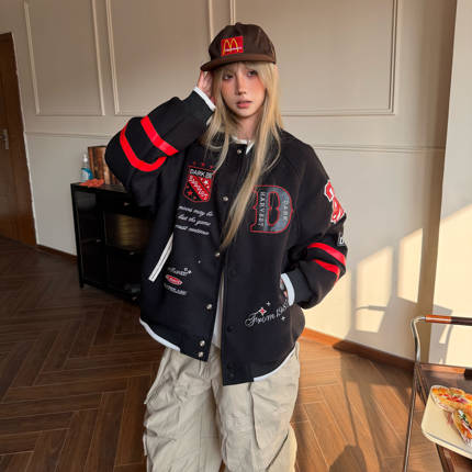 Amoeba美式复古字母刺绣撞色条纹夹棉棒球服外套男女春季新款夹克