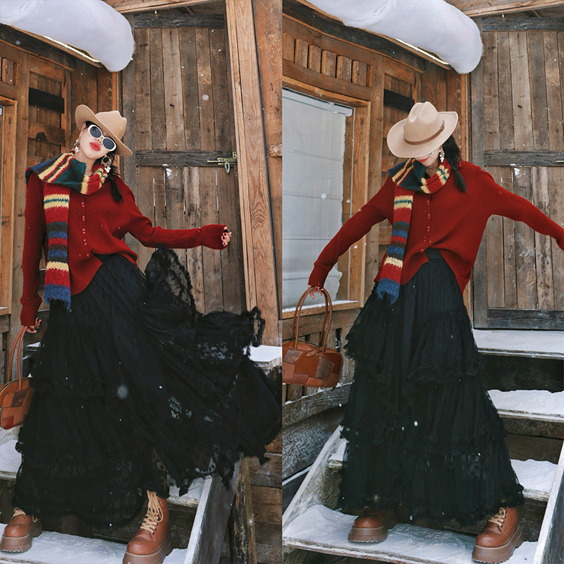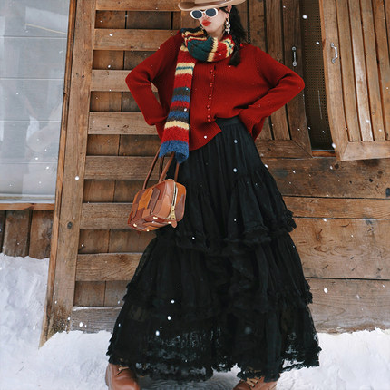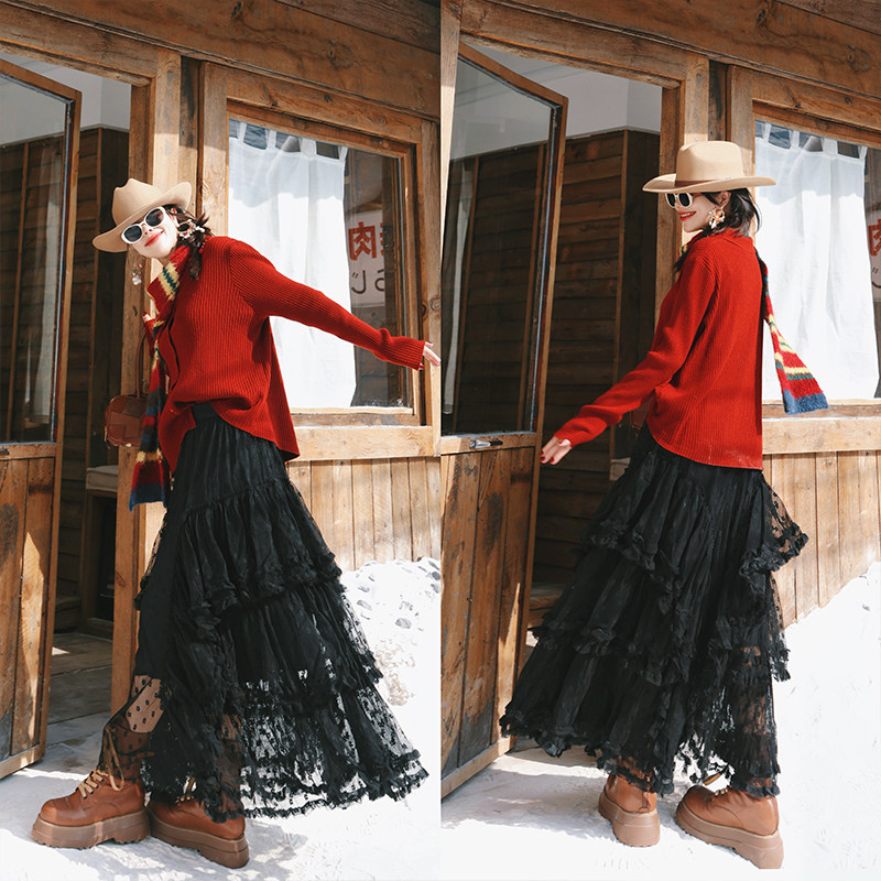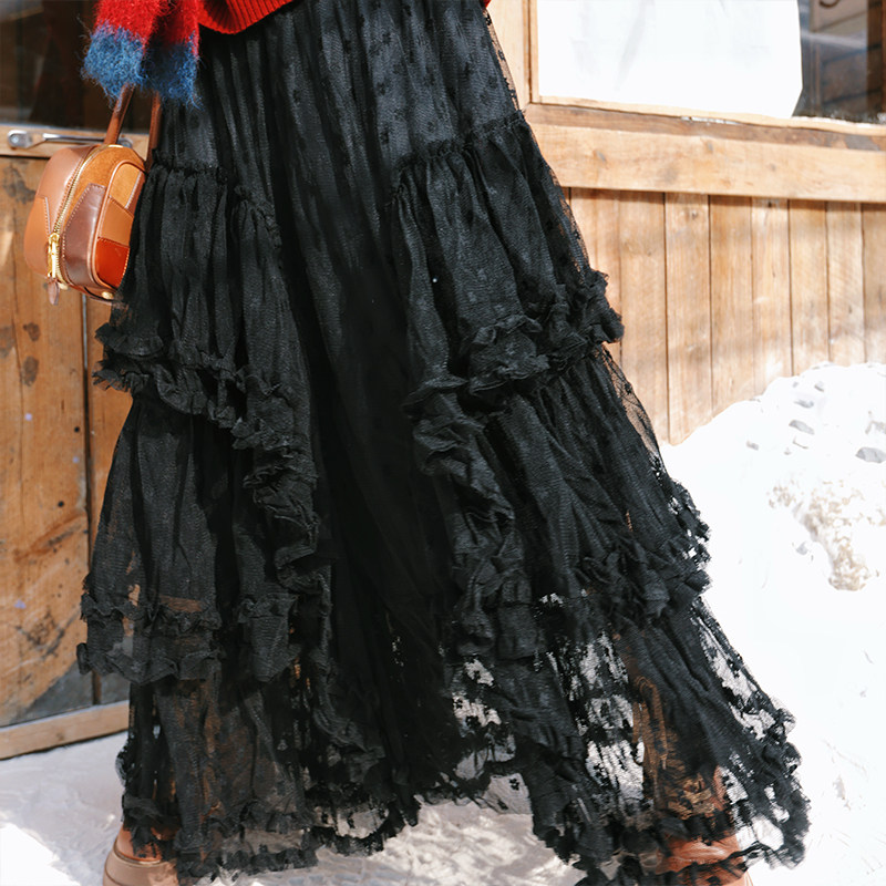 麦叙《夜风铃》复古黑色蕾丝绣花不规则网纱半身裙a字大摆蓬蓬裙