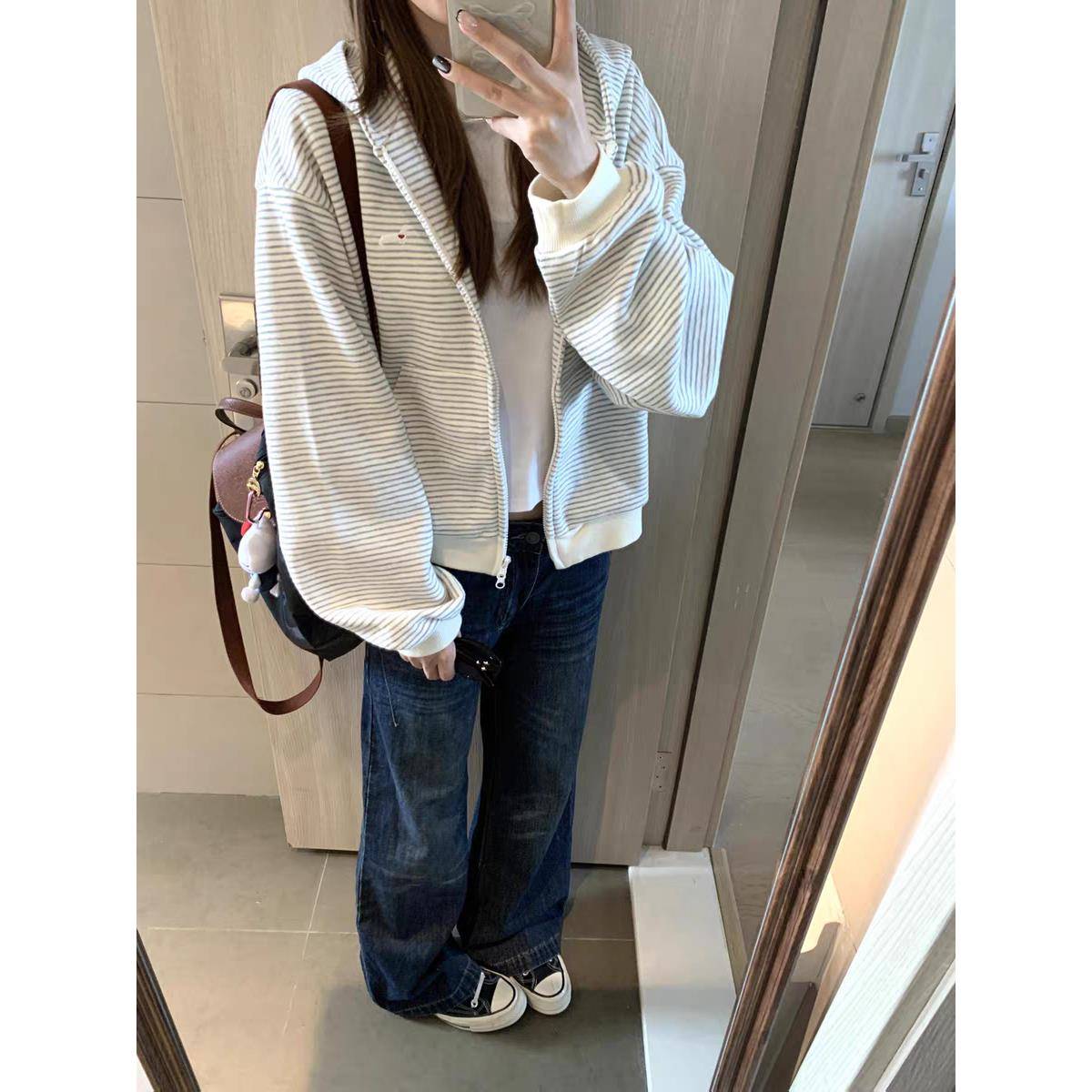 美式复古条纹连帽卫衣女2025秋冬新款加绒加厚设计感小众开衫外套