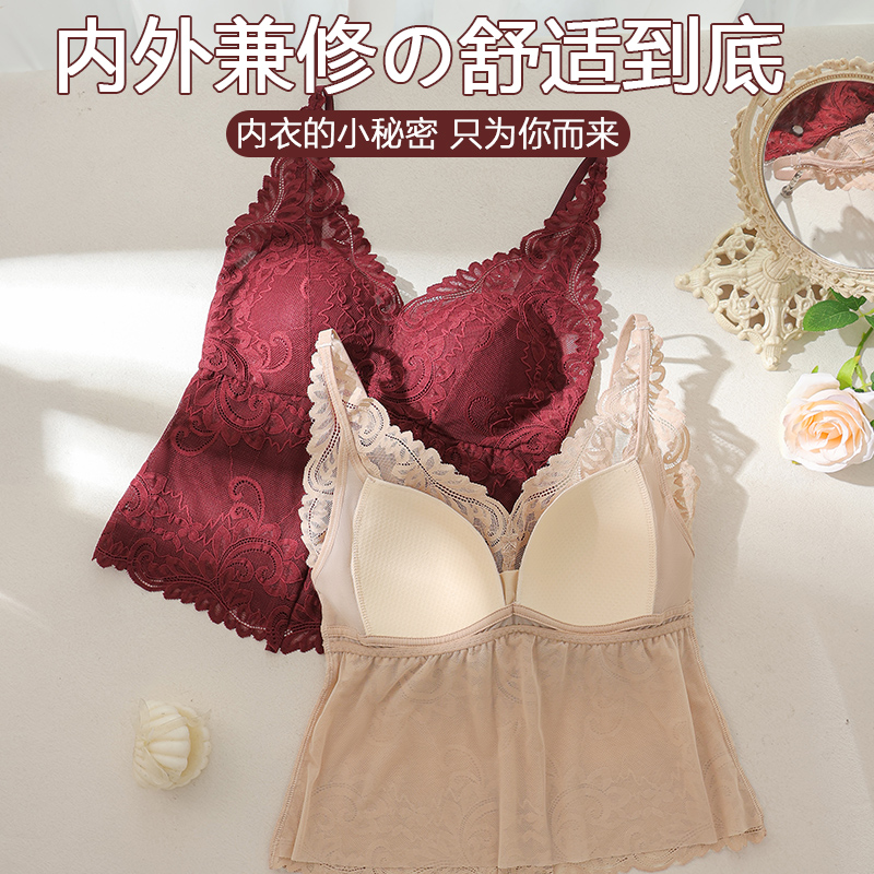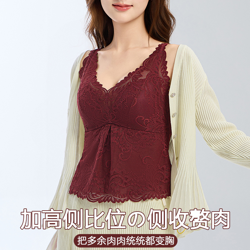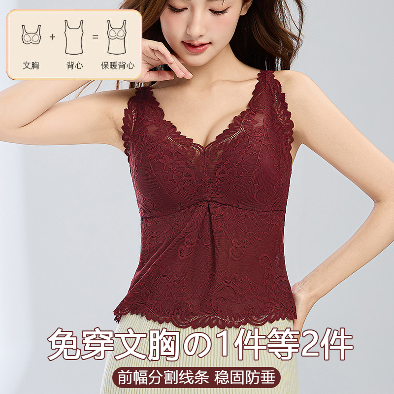 法式深V蕾丝保暖内衣背心女带胸垫聚拢修身显瘦美背吊带上衣红色