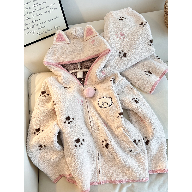 可爱小猫爪子印花半边绒长袖睡衣女秋冬季新款家居服加厚长裤套装