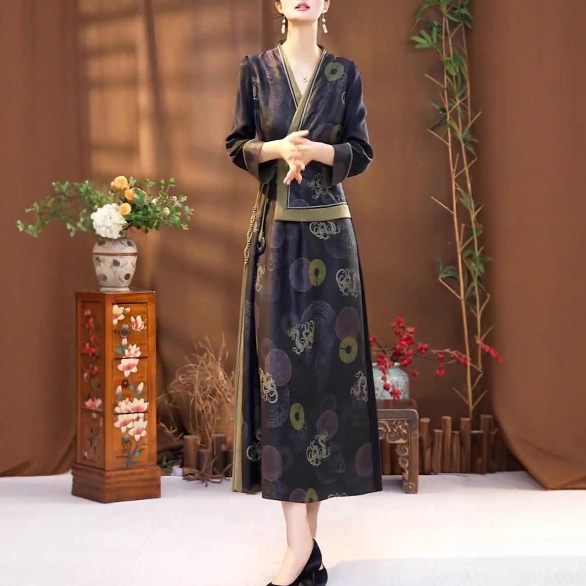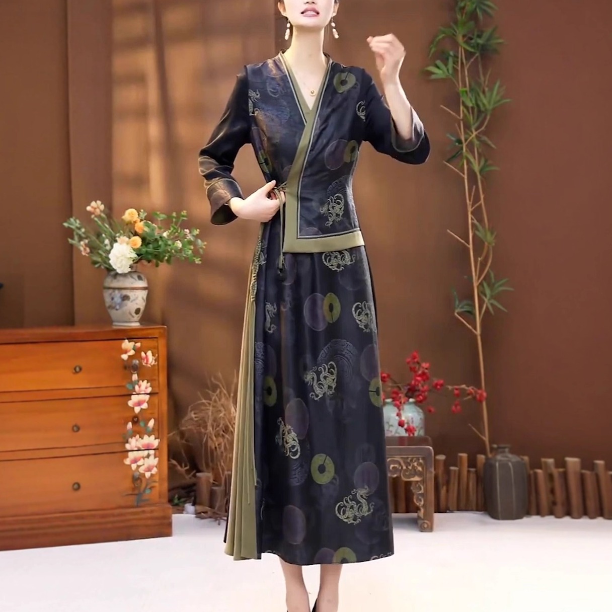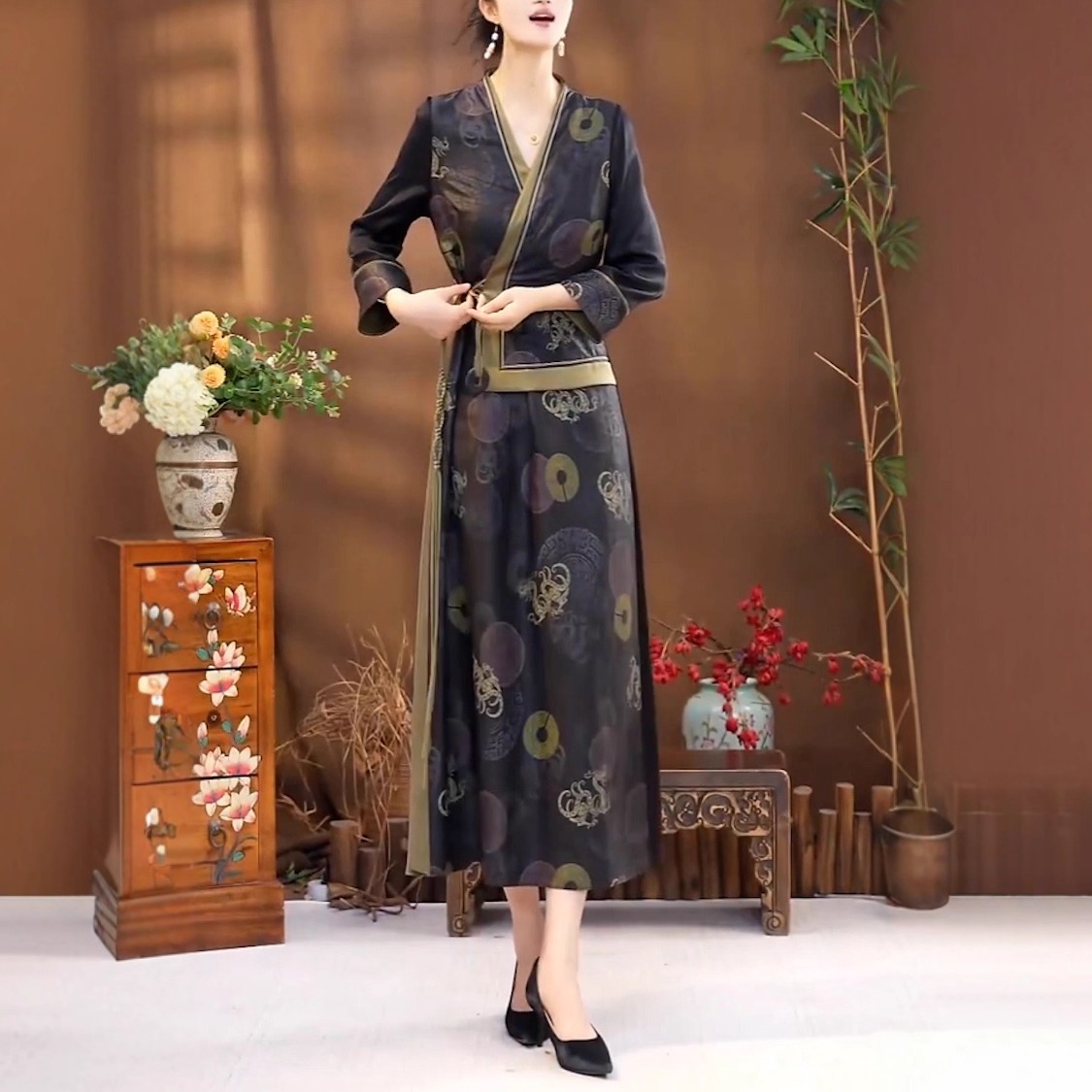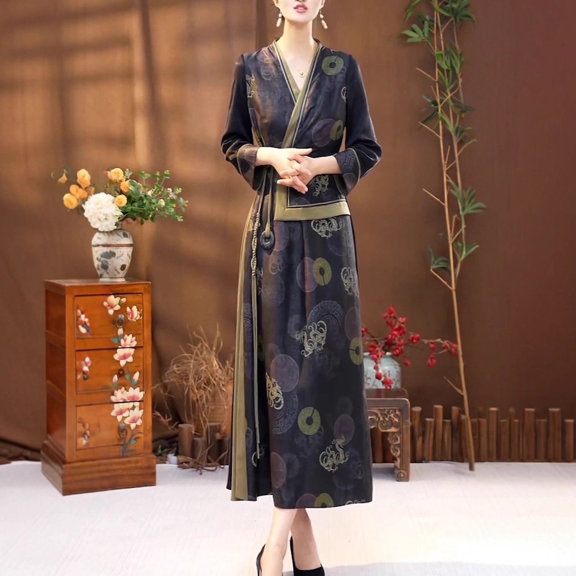 中式国风复古假两件改良旗袍长裙