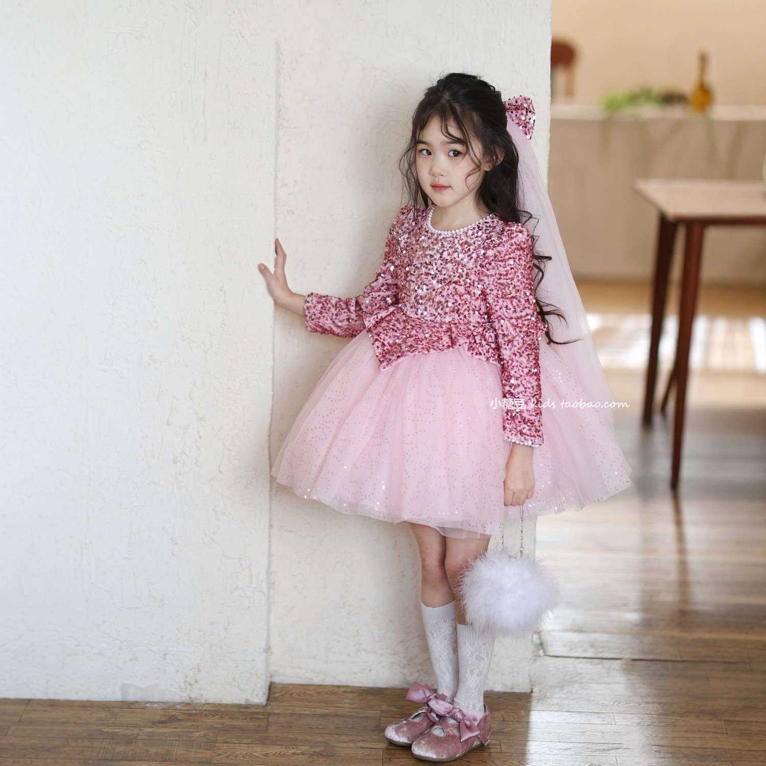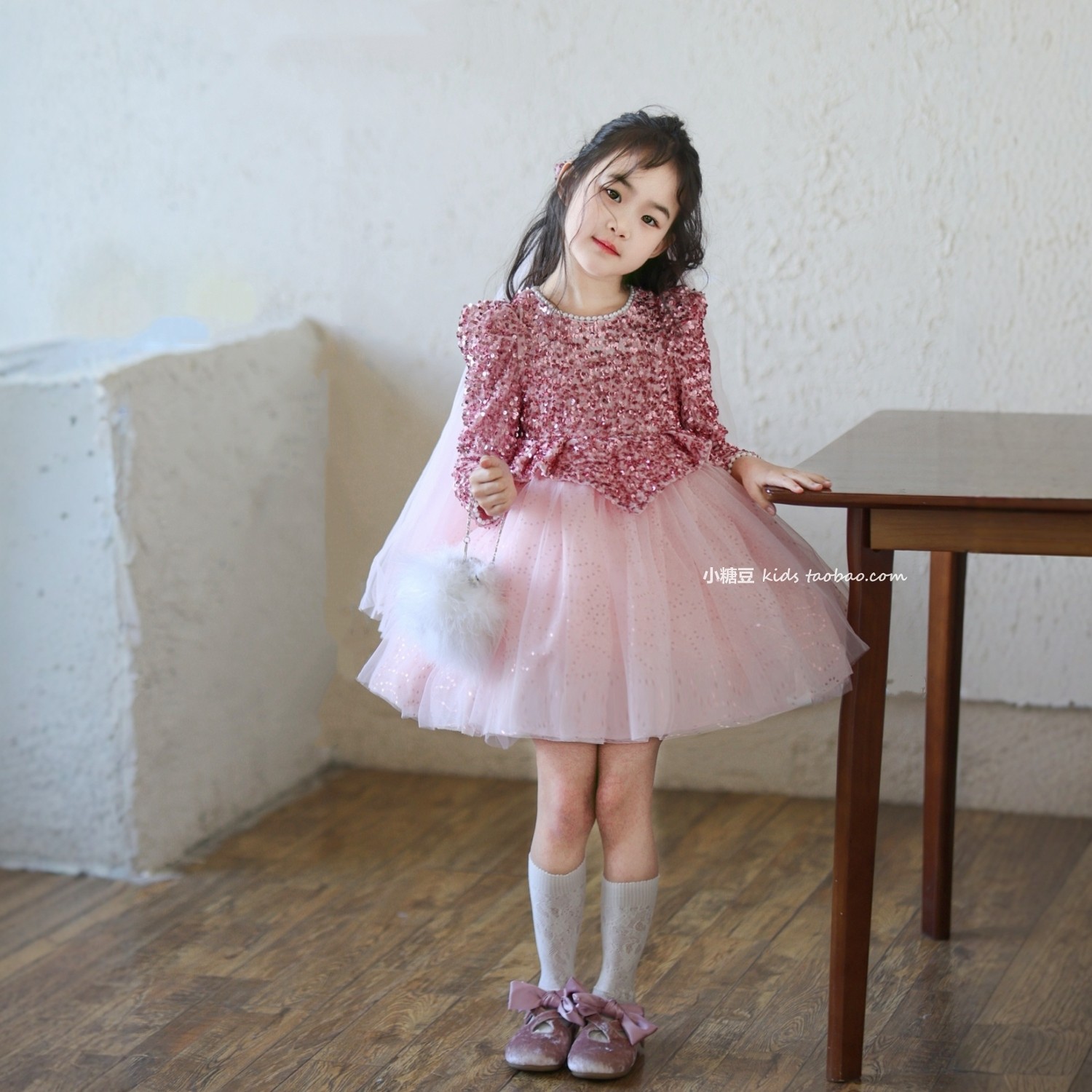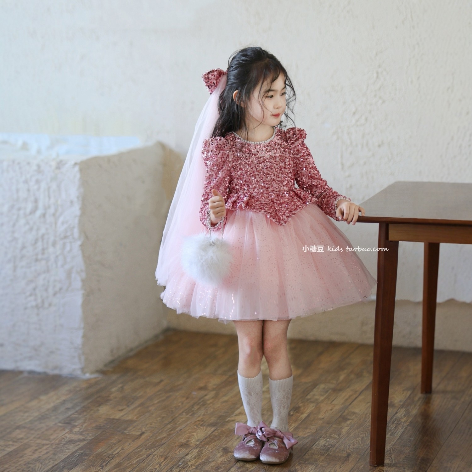 女童粉色闪闪丝绒亮片网纱连衣裙2025秋冬新款女孩加绒生日公主裙