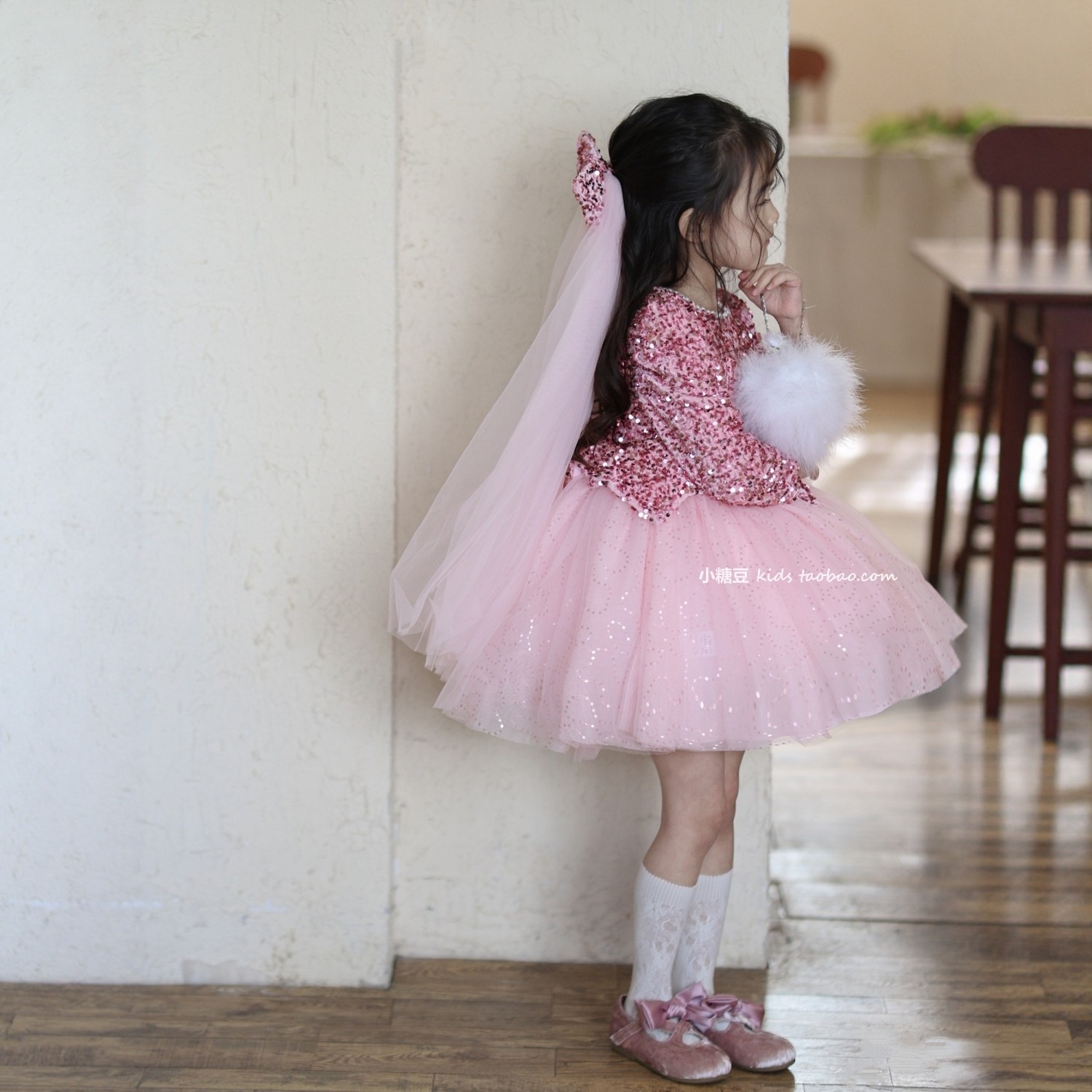 女童粉色闪闪丝绒亮片网纱连衣裙