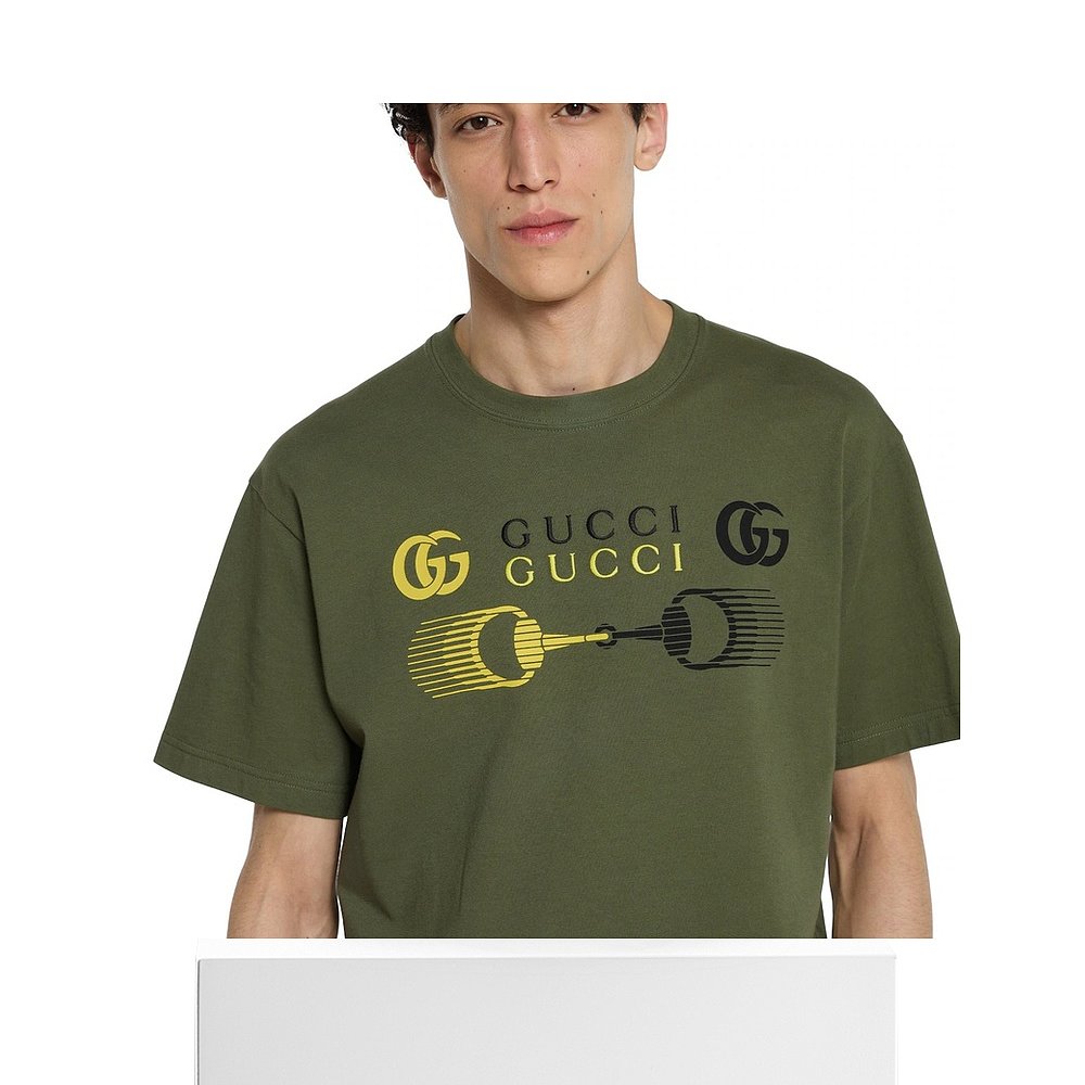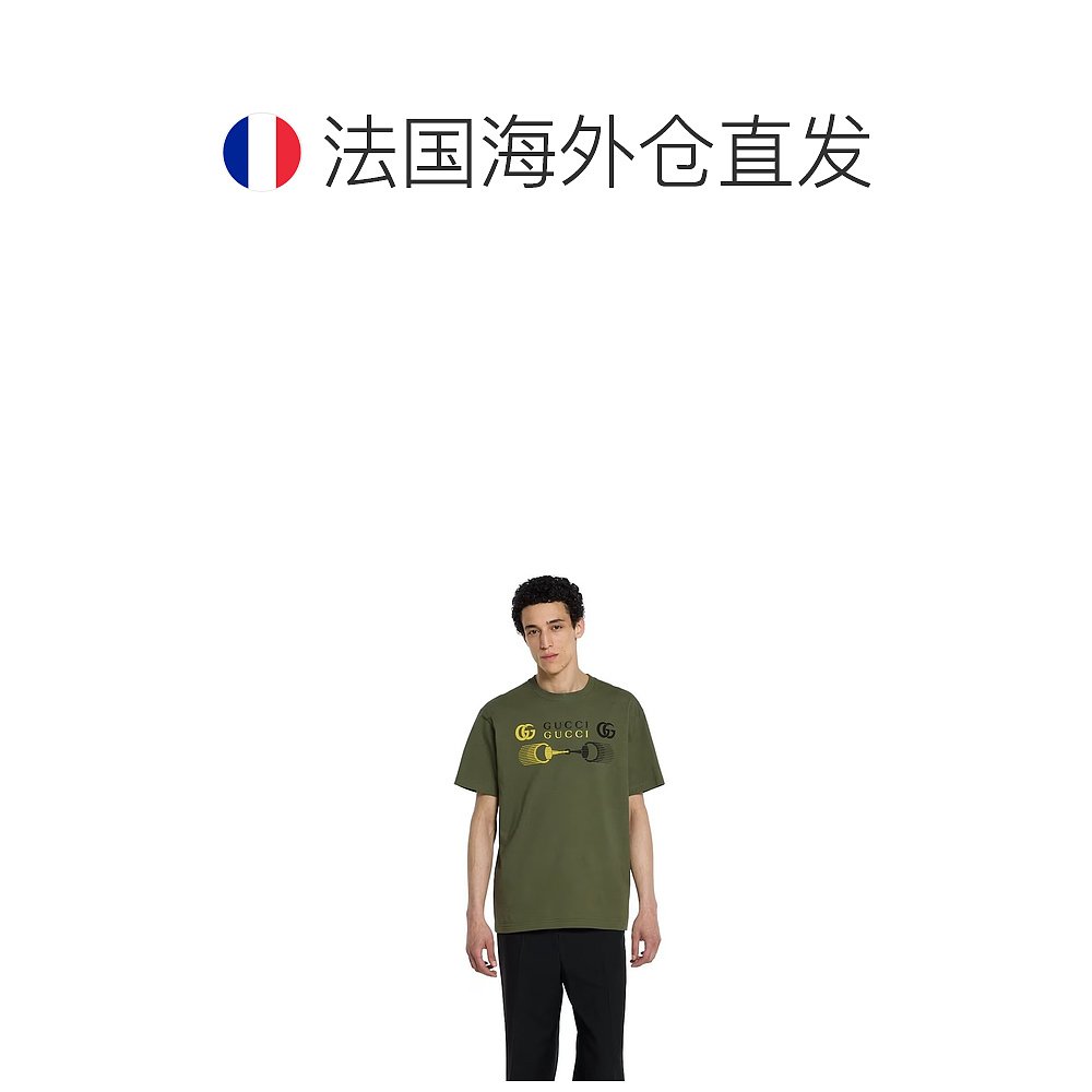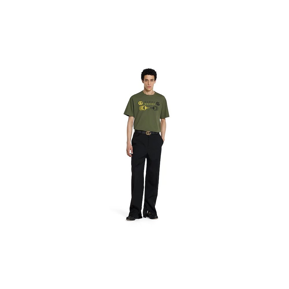 自营欧洲直邮Gucci/古驰 男士森林绿棉双G马衔扣印花短袖T恤针织