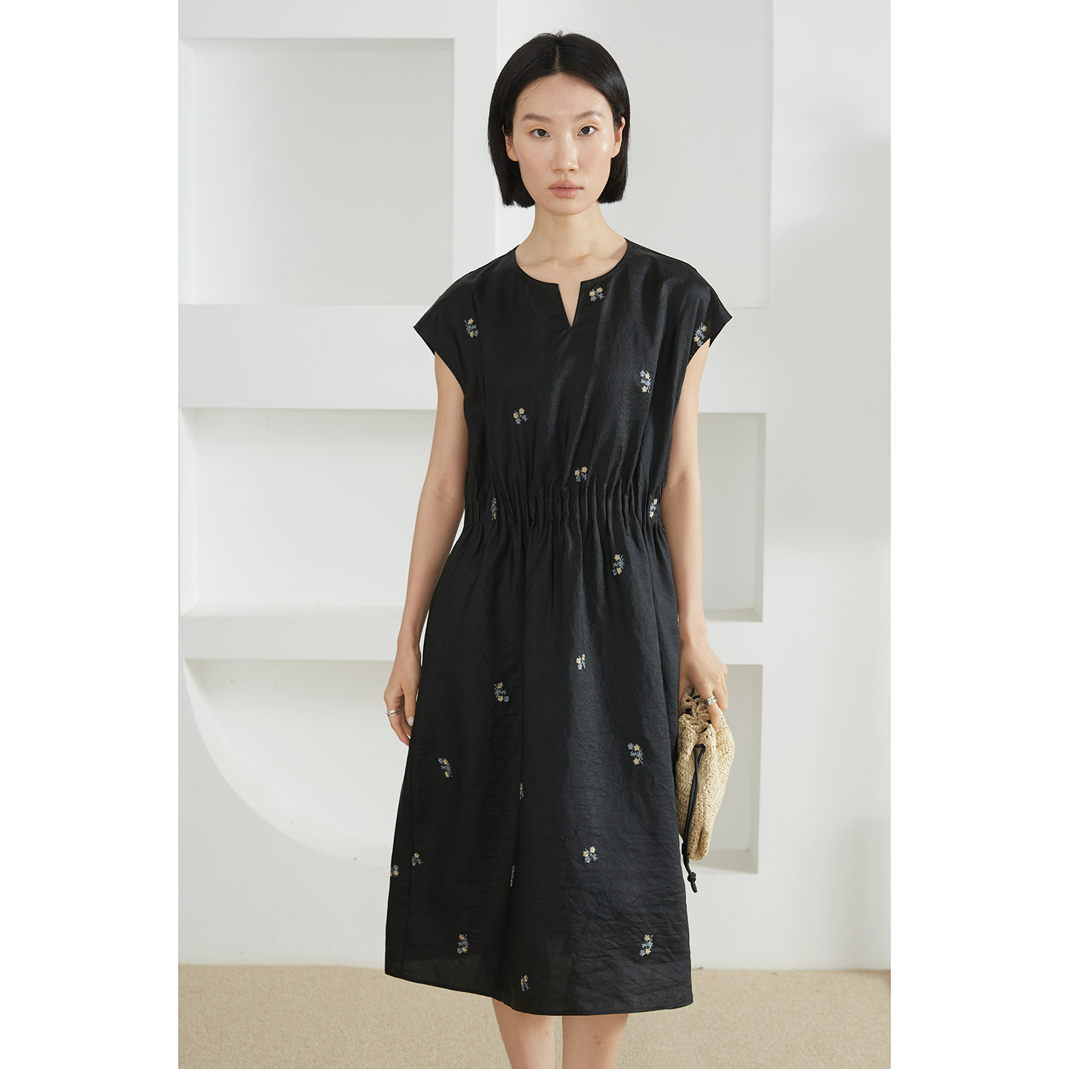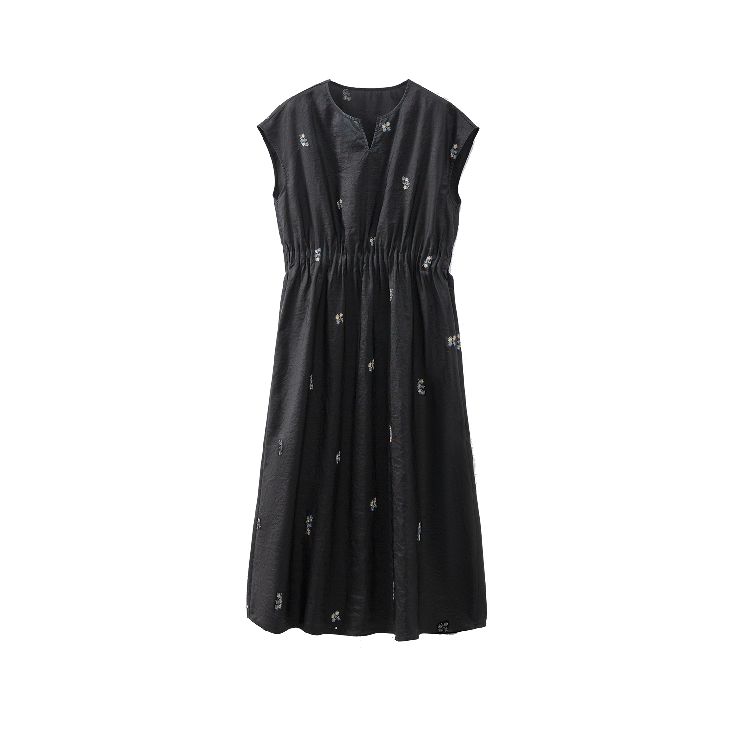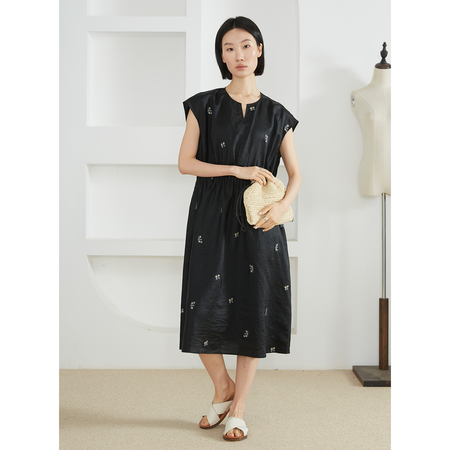 一丝牵 重工刺绣油皮龟纹真丝香云纱连衣裙100%桑蚕丝无袖长裙夏