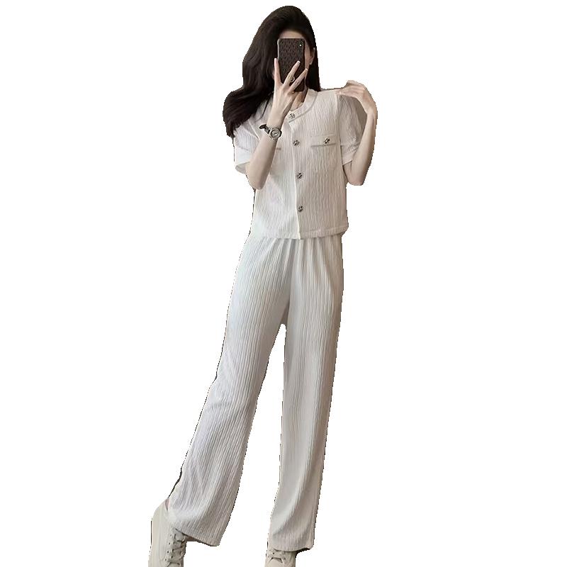 夏季新款短袖小香风圆领时尚套装女洋气薄款半袖直筒阔腿裤两件套