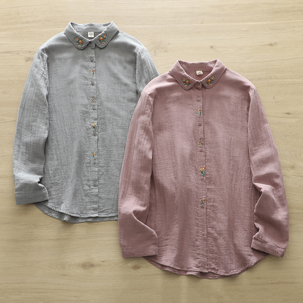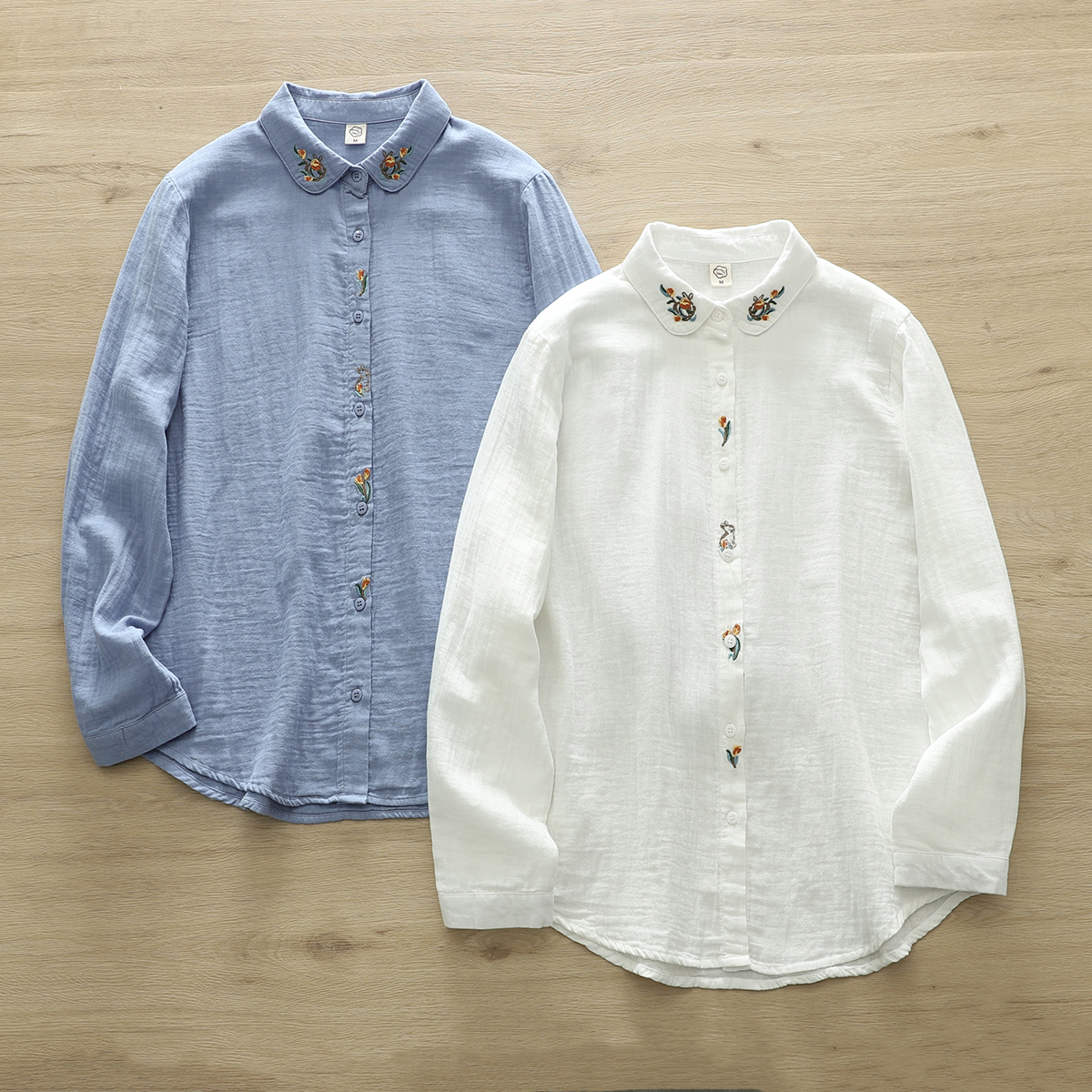 春装白色双层棉纱长袖白衬衫女宽松文艺百搭刺绣小花纯棉打底衬衣